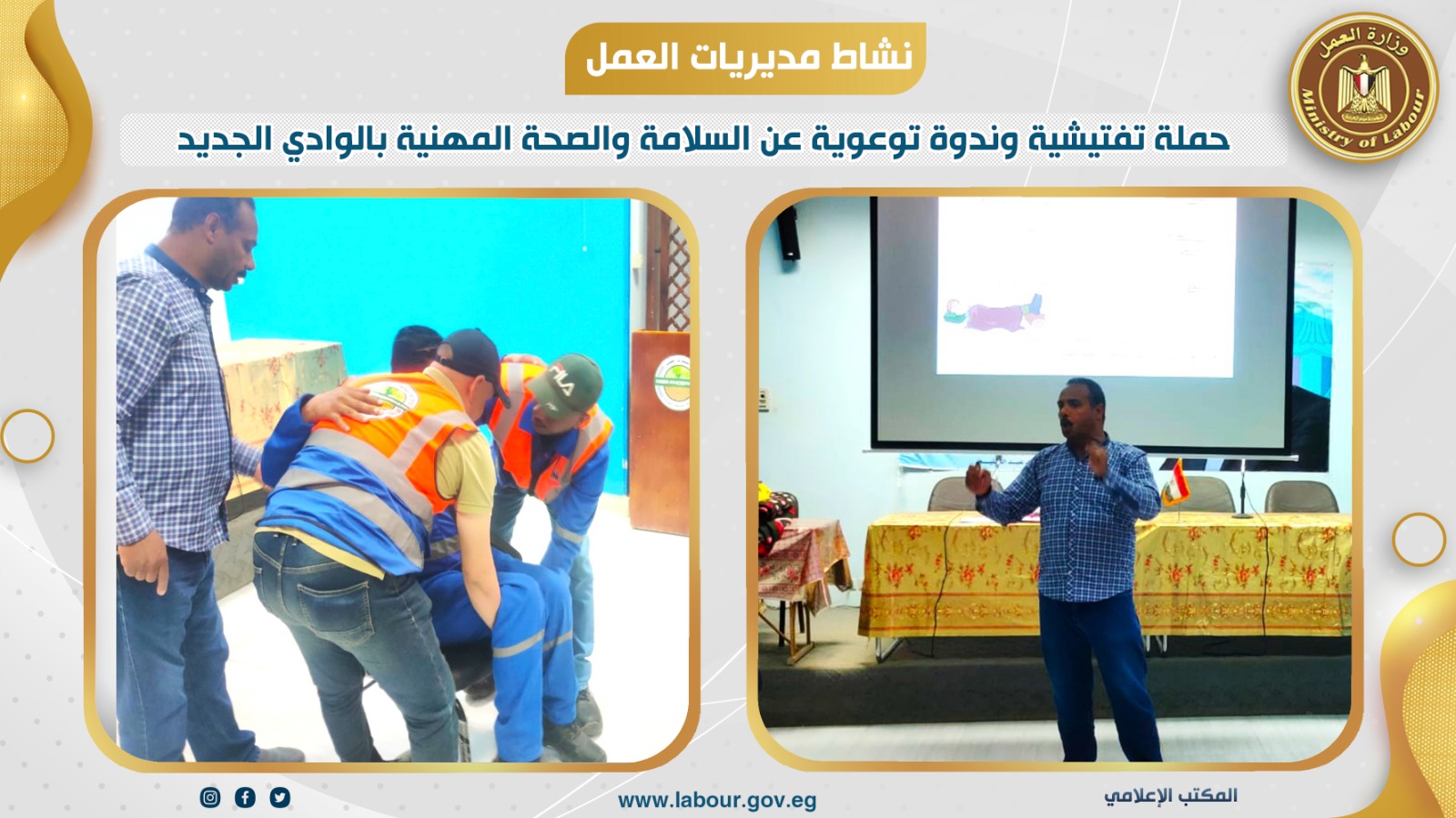 نفذت مديرية العمل بالوادى الجديد ندوة ودورة تدريبية لمدة أربعة أيام، عن اشتراطات السلامة والصحة المهنية والإسعافات الأولية، حاضر فيها مدير إدارة السلامة والصحة المهنية ومدير ومفتش السلامة والصحة المهنية بالخارجة وعضو من هيئة الاسعاف، وذلك بمشاركة عدد 19 من أعضاء لجنة السلامة والصحة المهنية بشركة فوسفات مصر بأبو طرطور بالخارجة .