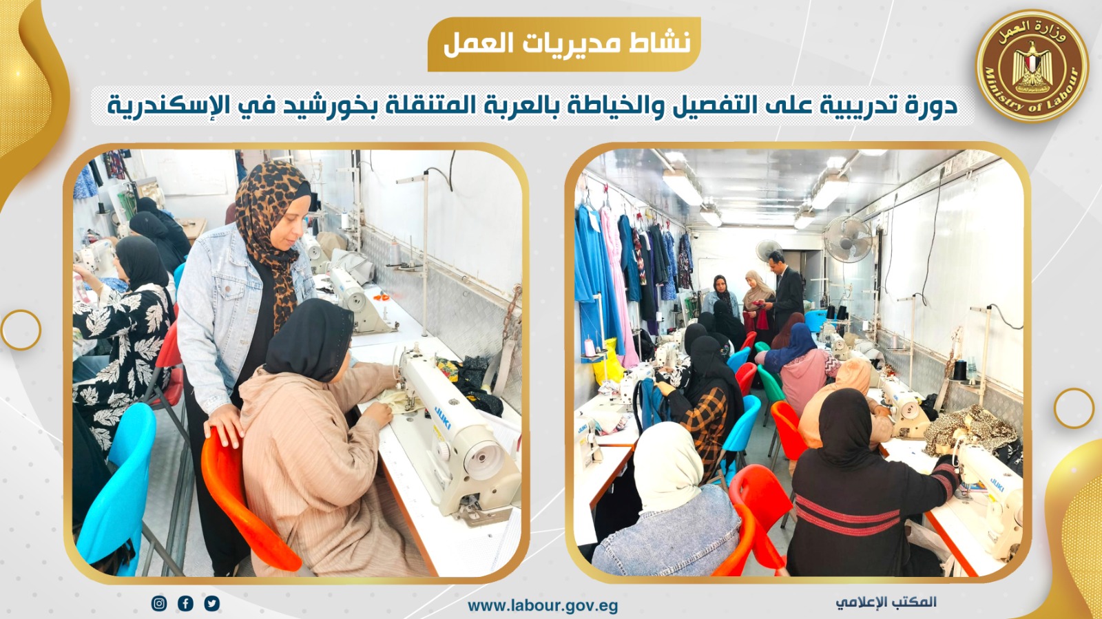 تفقد المهندس محمد كمال وكيل مديرية العمل بالإسكندرية الدورة التدريبية على مهنة التفصيل والخياطة بالعربة المتنقلة بمنطقة خورشيد، في إطار المبادرة الرئاسية "حياة كريمة " لتنمية القرى الأكثر احتياجاً، من أجل تقديم خدماتها التدريبية على المهن التي يحتاجها سوق العمل وتخريج دفعات جديدة من شباب المنطقة، حيث بدأت ثاني الدورات التدريبية وذلك لعدد 10 متدربات، يتم تدريبهن نظرياً وعملياً لمدة 100 ساعة تدريبية لمدة 5 أسابيع، وذلك أيضاً في إطار مبادرة مهنتك مستقبلك والتي أطلقتها الوزارة لتدريب الشباب من الجنسين في المحافظات على المهن التي يتطلبها سوق العمل الداخلي والخارجي، تحت إشراف الإدارة المركزية للتدريب المهني بالوزارة. وقد أشاد المتدربين بمستوى الدورة وكفاءة المدرب وتقدموا بالشكر للوزير محمد جبران على دعمه للشباب وتقديم الخدمات بسهولة ويسر. جاء ذلك بحضور داليا عبد المجيد مدير إدارة مراكز التدريب المهني.