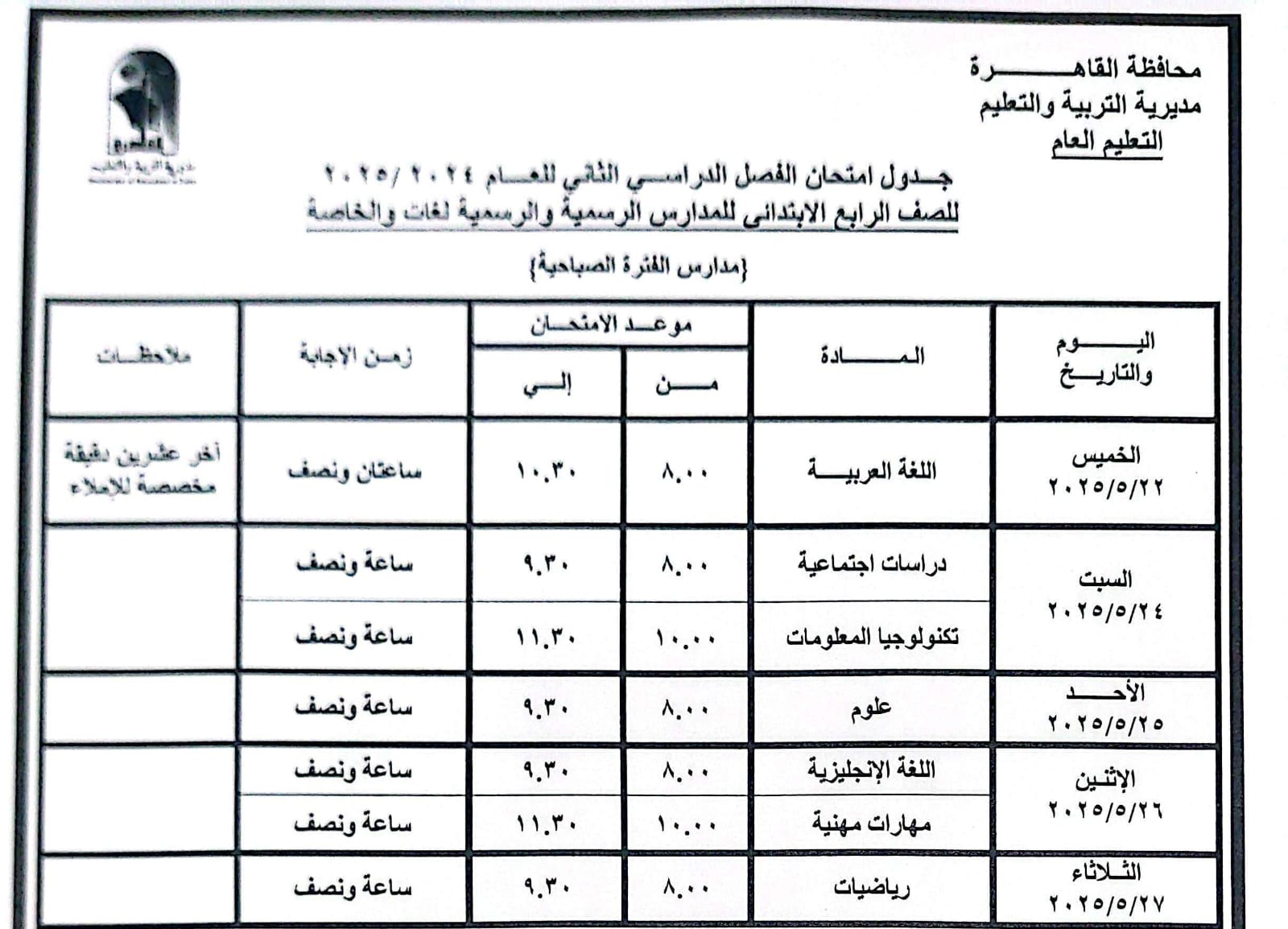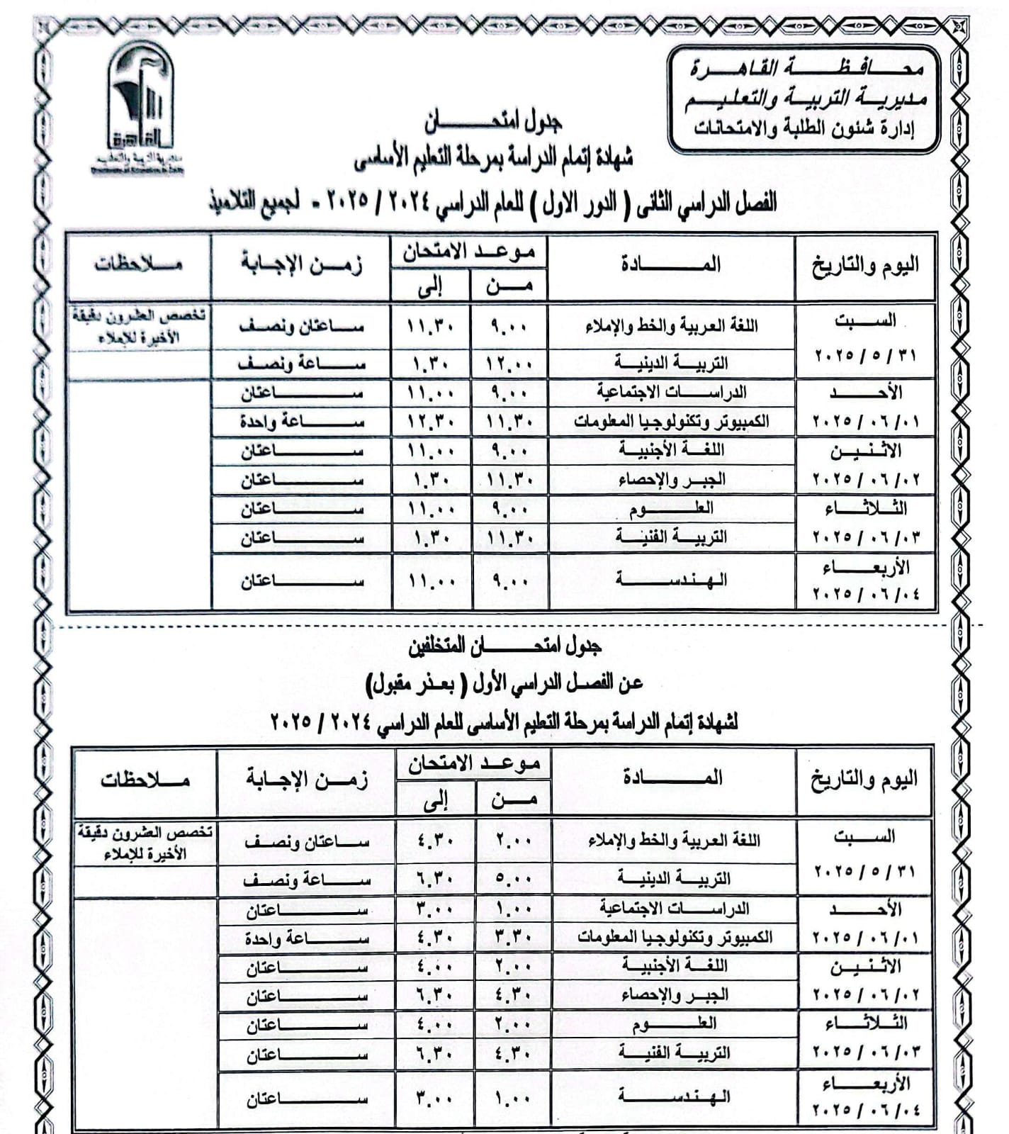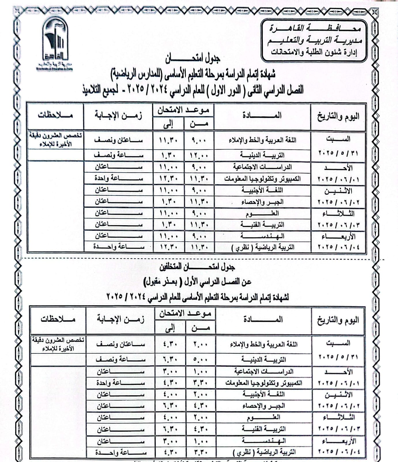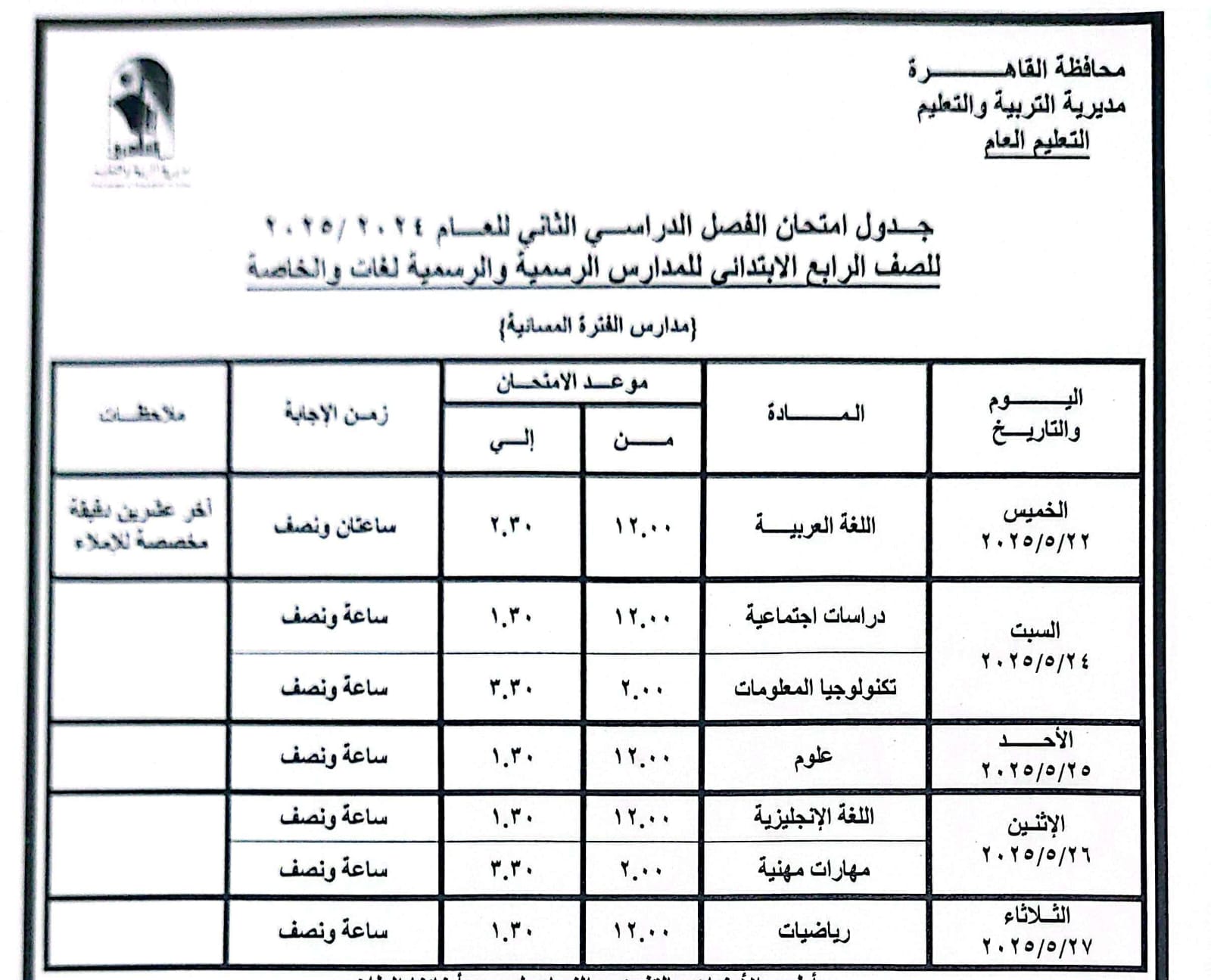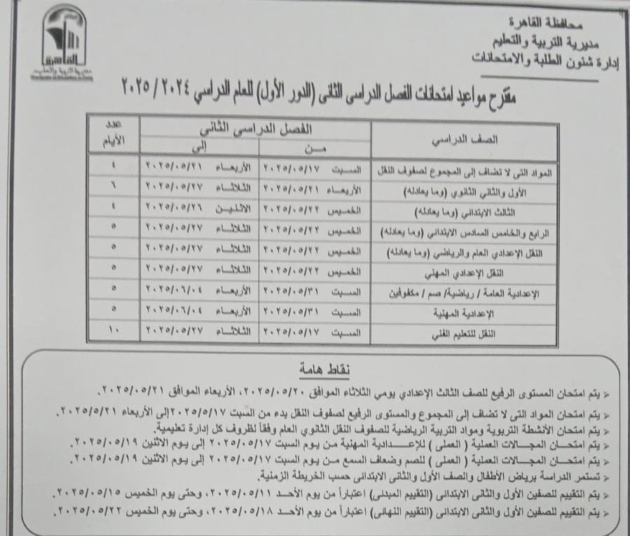 وأشارت سماح إبراهيم مدير مدير مديرية التربية والتعليم بالقاهرة إلى أن طلبة وطالبات الصف الأول والثاني الثانوي وما يعادلها سيؤدون الامتحانات في الفترة من الأربعاء ٢١ مايو إلى الثلاثاء ٢٧ مايو ، وسيؤدي طلبة وطالبات الصف الثالث الابتدائي الامتحانات في الفترة من الخميس ٢٢ مايو إلى الاثنين ٢٦ مايو ، والصف الرابع والخامس والسادس الابتدائي وما يعادله في الفترة من الخميس ٢٢ مايو حتى الثلاثاء ٢٧ مايو ، وامتحانات النقل الإعدادي العام والرياضي والمهنى وما يعادله فى الفترة من الخميس ٢٢ مايو حتى الثلاثاء ٢٧ مايو ، وامتحانات الإعدادية العامة والرياضية والصم والمكفوفين والمهنية من السبت ٣١ مايو حتى الاربعاء ٤ يونيو ، وامتحانات النقل للتعليم الفني من السبت ١٧ مايو حتى الثلاثاء ٢٧ مايو .