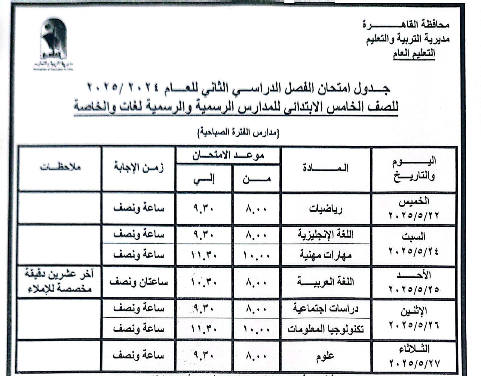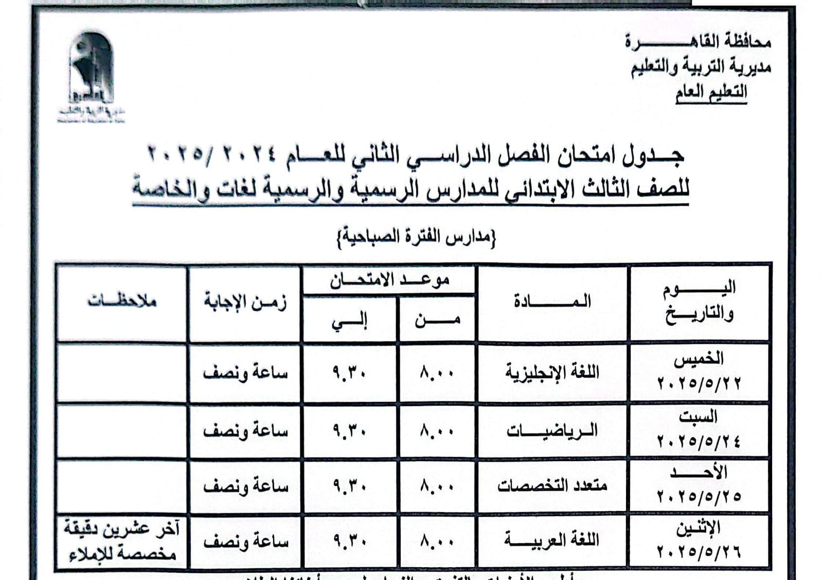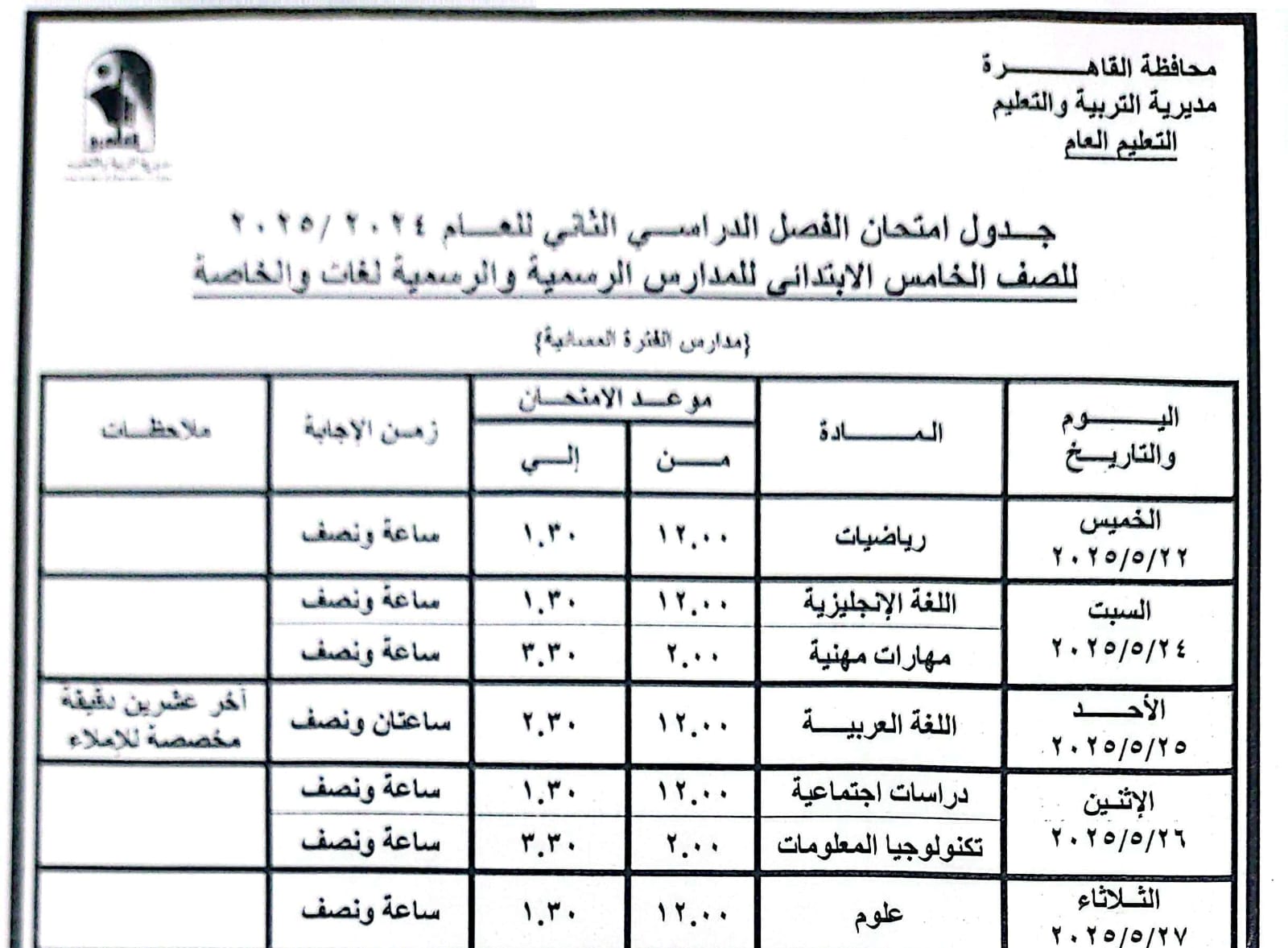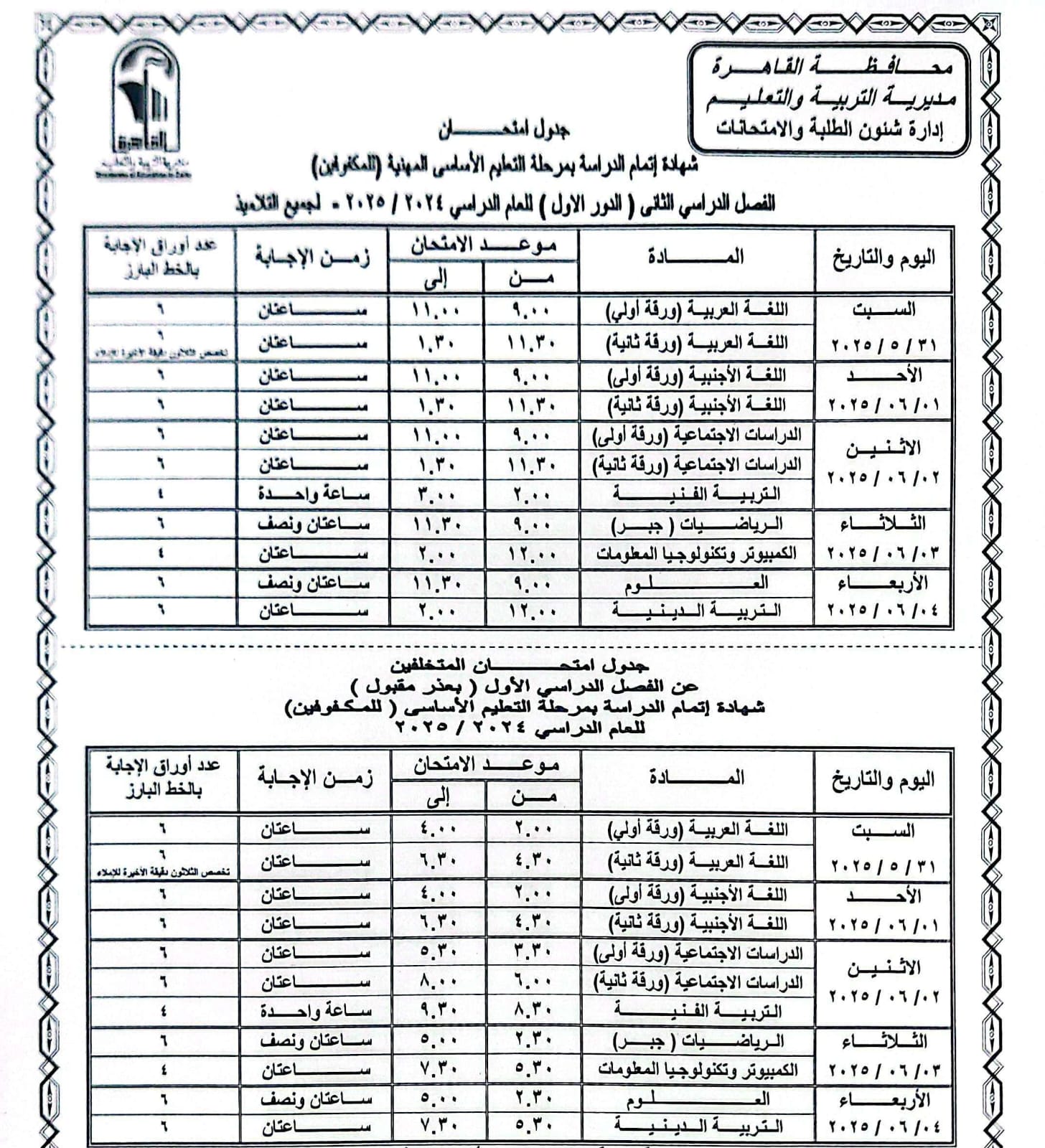 وأشارت سماح إبراهيم مدير مدير مديرية التربية والتعليم بالقاهرة إلى أن طلبة وطالبات الصف الأول والثاني الثانوي وما يعادلها سيؤدون الامتحانات في الفترة من الأربعاء ٢١ مايو إلى الثلاثاء ٢٧ مايو ، وسيؤدي طلبة وطالبات الصف الثالث الابتدائي الامتحانات في الفترة من الخميس ٢٢ مايو إلى الاثنين ٢٦ مايو ، والصف الرابع والخامس والسادس الابتدائي وما يعادله في الفترة من الخميس ٢٢ مايو حتى الثلاثاء ٢٧ مايو ، وامتحانات النقل الإعدادي العام والرياضي والمهنى وما يعادله فى الفترة من الخميس ٢٢ مايو حتى الثلاثاء ٢٧ مايو ، وامتحانات الإعدادية العامة والرياضية والصم والمكفوفين والمهنية من السبت ٣١ مايو حتى الاربعاء ٤ يونيو ، وامتحانات النقل للتعليم الفني من السبت ١٧ مايو حتى الثلاثاء ٢٧ مايو .