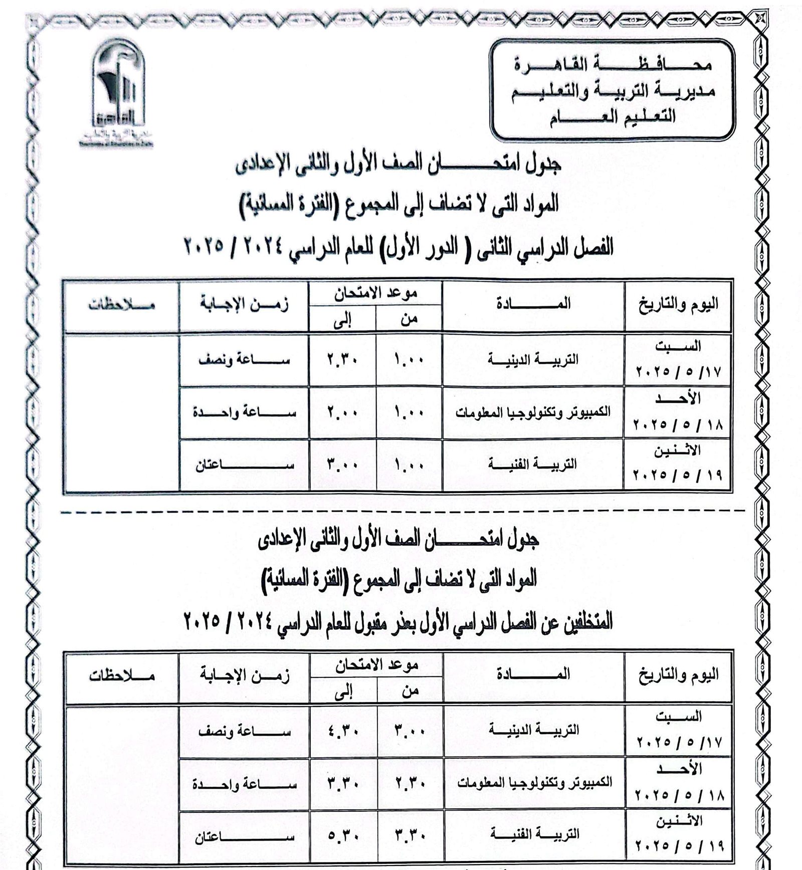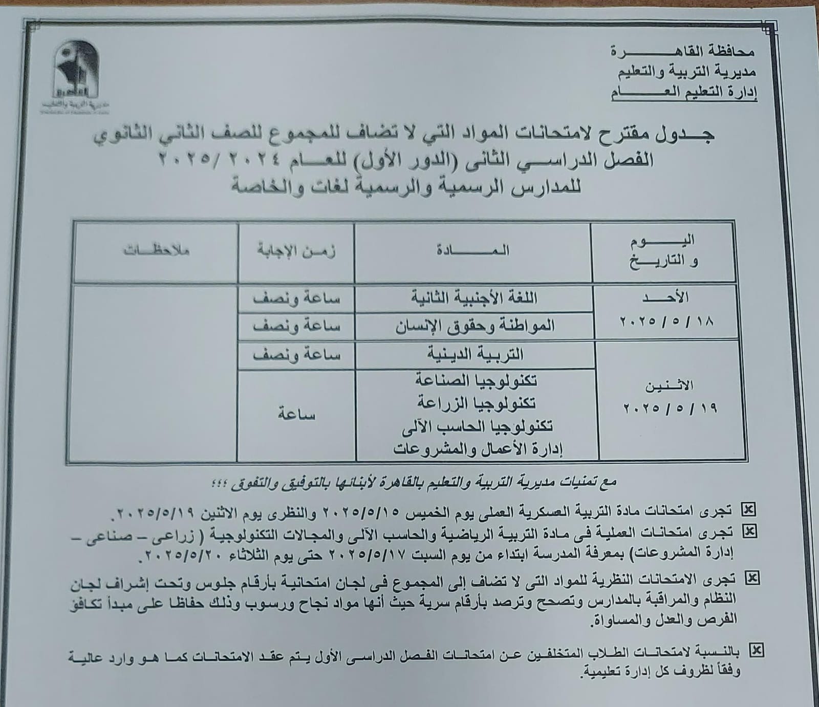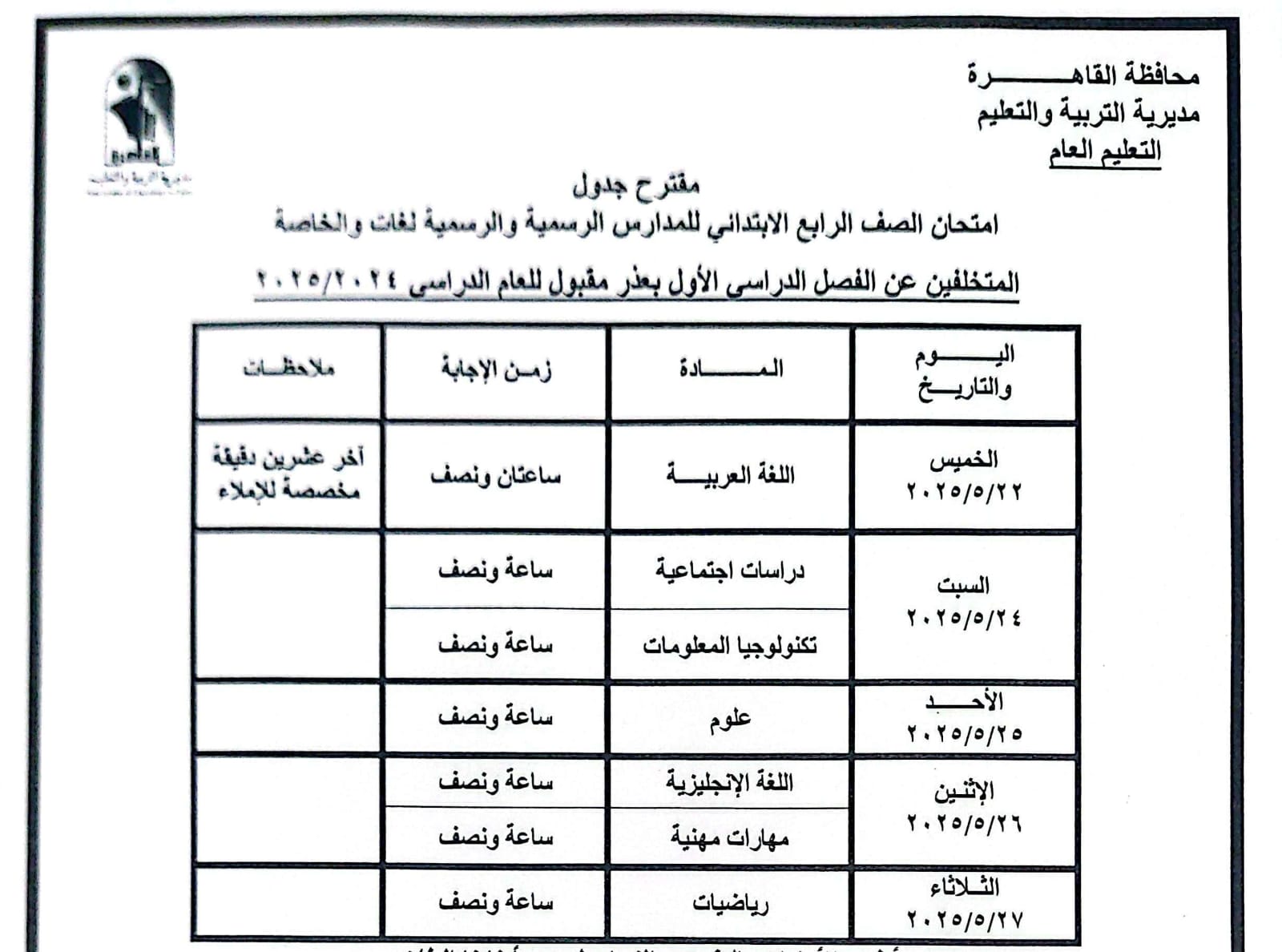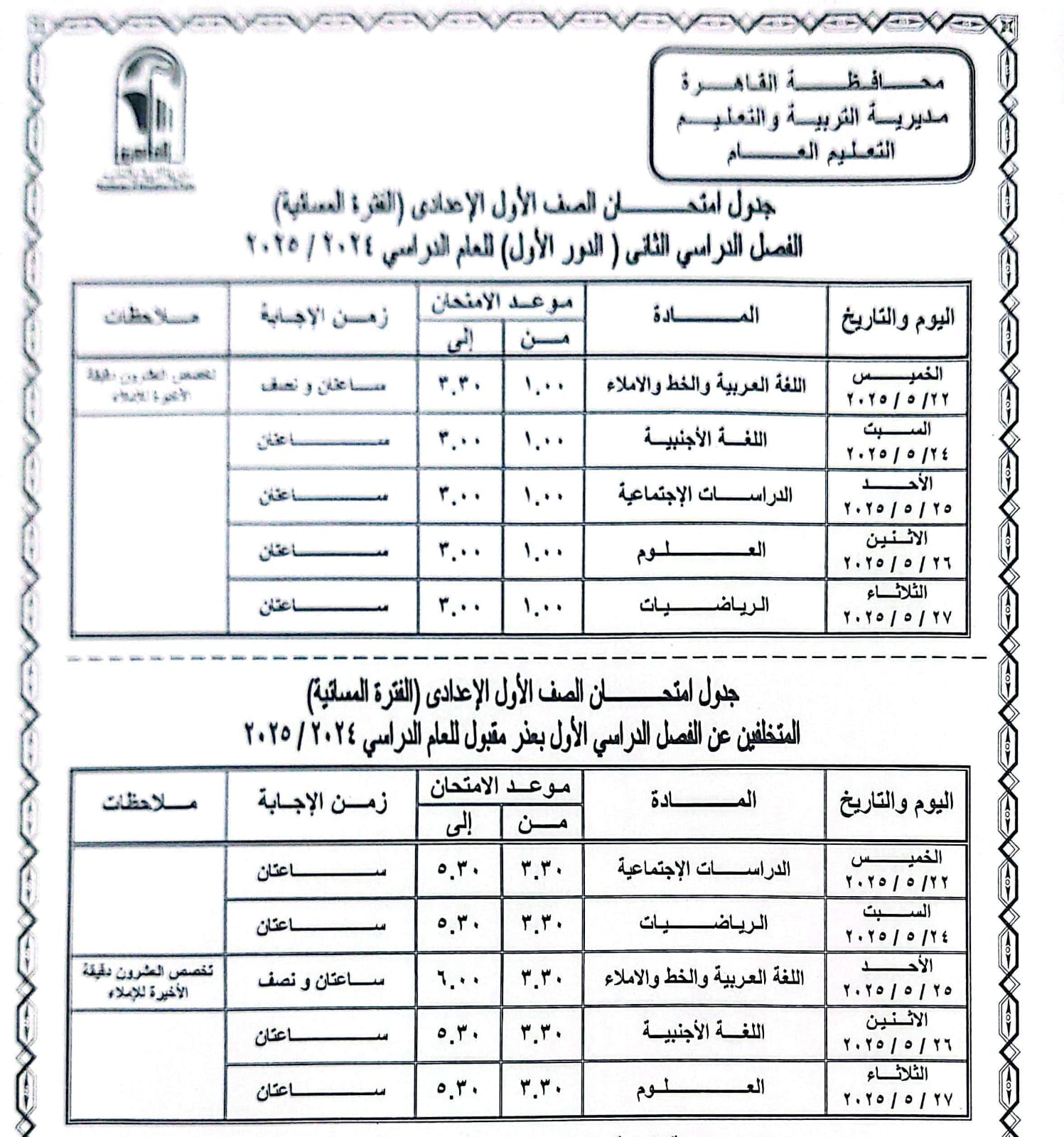 وأشارت سماح إبراهيم مدير مدير مديرية التربية والتعليم بالقاهرة إلى أن طلبة وطالبات الصف الأول والثاني الثانوي وما يعادلها سيؤدون الامتحانات في الفترة من الأربعاء ٢١ مايو إلى الثلاثاء ٢٧ مايو ، وسيؤدي طلبة وطالبات الصف الثالث الابتدائي الامتحانات في الفترة من الخميس ٢٢ مايو إلى الاثنين ٢٦ مايو ، والصف الرابع والخامس والسادس الابتدائي وما يعادله في الفترة من الخميس ٢٢ مايو حتى الثلاثاء ٢٧ مايو ، وامتحانات النقل الإعدادي العام والرياضي والمهنى وما يعادله فى الفترة من الخميس ٢٢ مايو حتى الثلاثاء ٢٧ مايو ، وامتحانات الإعدادية العامة والرياضية والصم والمكفوفين والمهنية من السبت ٣١ مايو حتى الاربعاء ٤ يونيو ، وامتحانات النقل للتعليم الفني من السبت ١٧ مايو حتى الثلاثاء ٢٧ مايو .