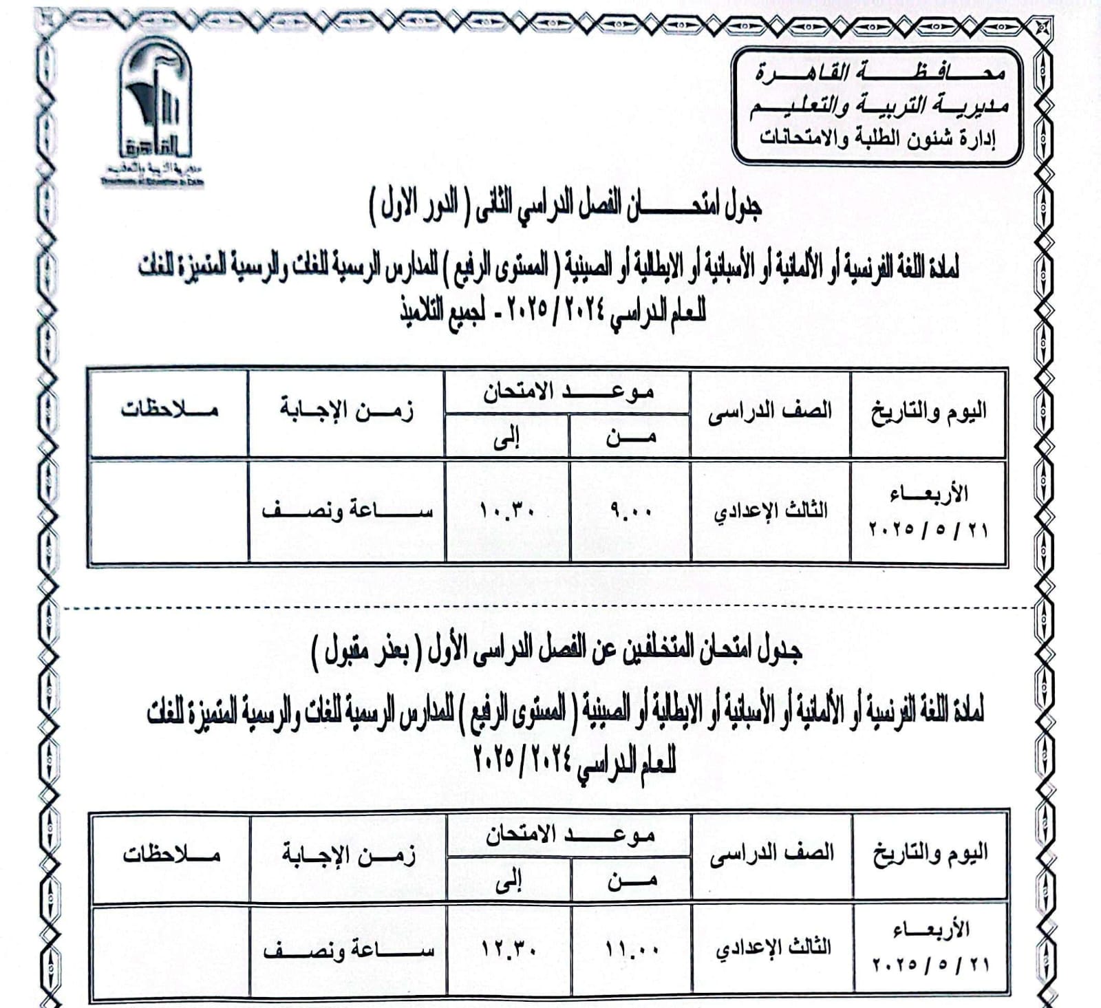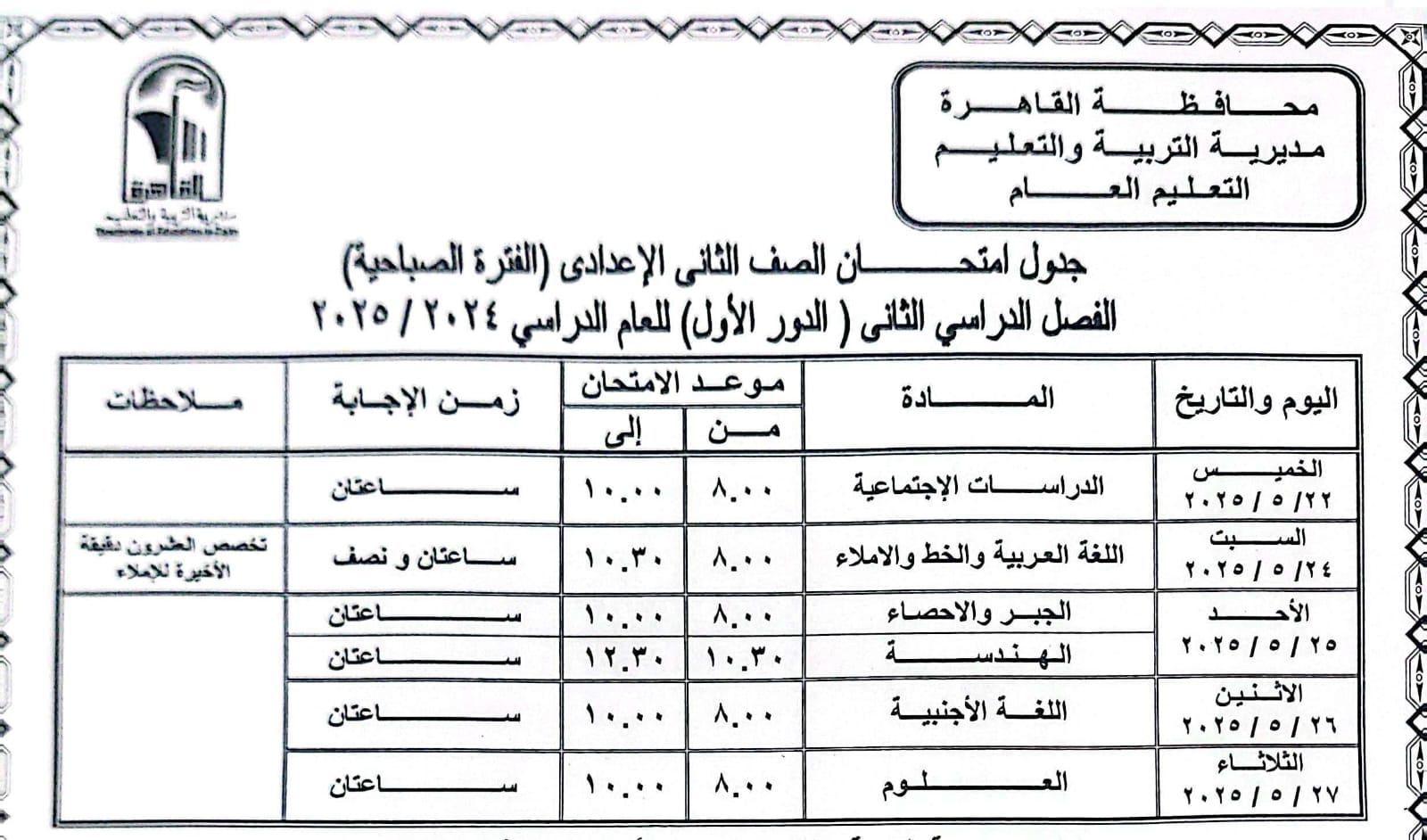 اعتمد الدكتور إبراهيم صابر محافظ القاهرة جدول امتحانات الفصل الدراسي الثانى للعام الدراسى 2024 - 2025 حيث تجرى الامتحانات خلال الفترة من 21 مايو إلى 4 يونيو 2025.