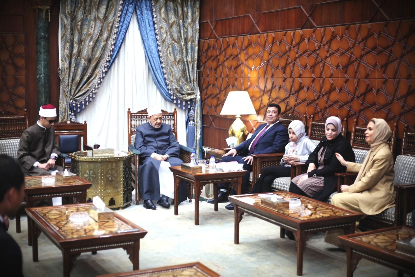 استقبل الإمام الأكبر الدكتور أحمد الطيب، شيخ الأزهر الشريف، أيضا، الطالب صاحب البصيرة، محمد أحمد حسن، الذي أمّ المصلين في صلاة التروايح خلال شهر رمضان 2025 بالجامع الأزهر، وذلك رفقة والدته وأشقائه.