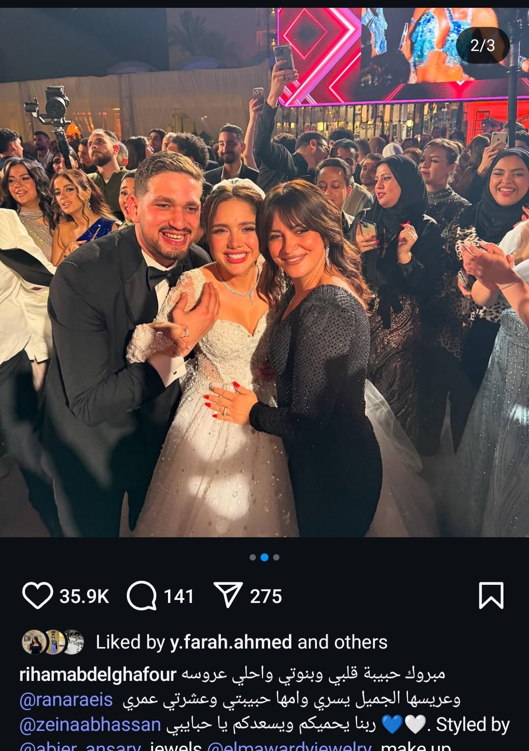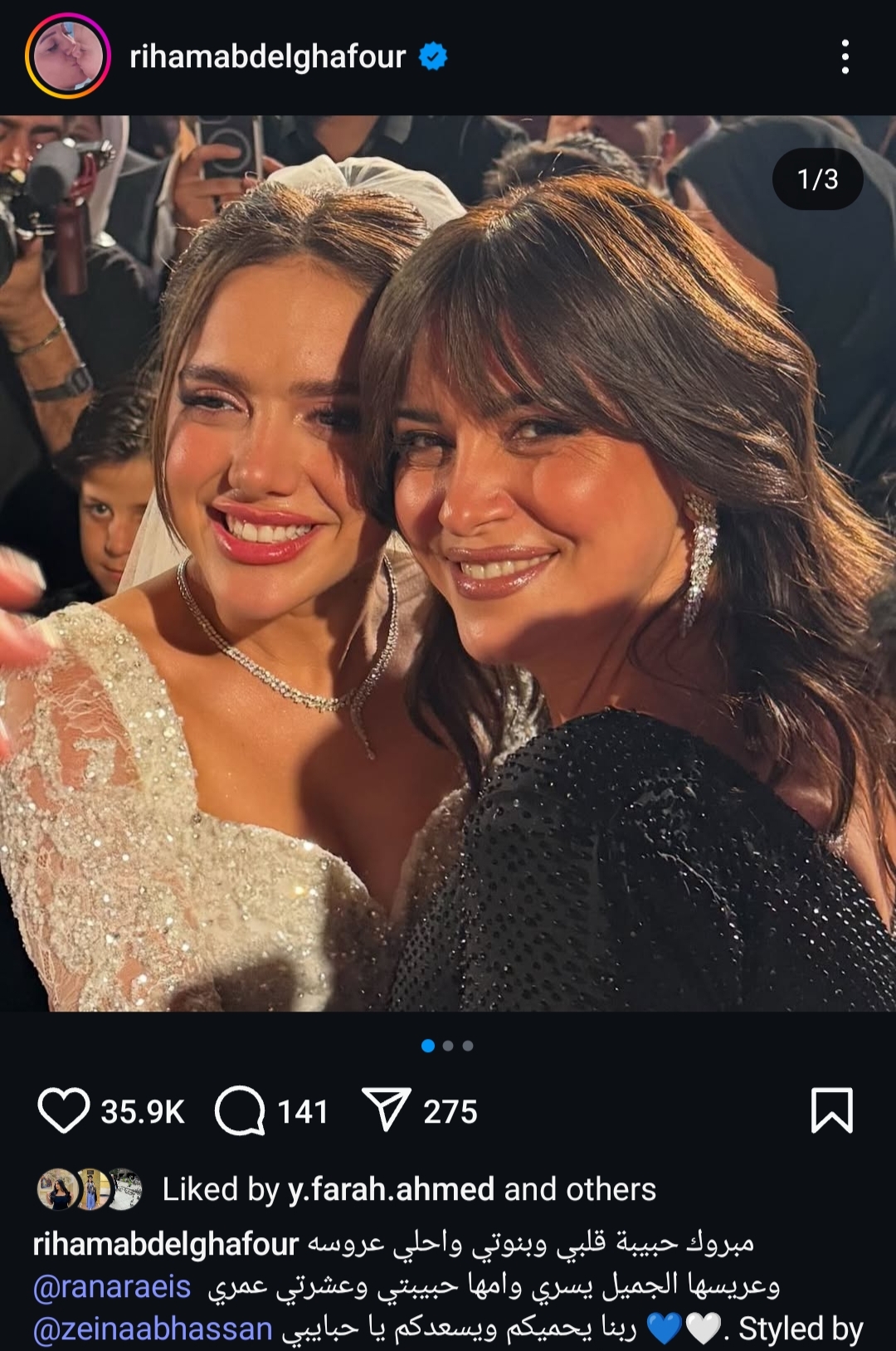 نشرت ريهام عبد الغفور صور من حفل الزفاف برفقة العروس على موقع التواصل الاجتماعى تبادل الصور والفيديوهات إنستجرام، والعريس، قائلة: "مبروك حبيبة قلبي وبنوتي وأحلى عروسة وعريسها الجميل يسري وامها حبيبتي وعشرت عمري، ربنا يحميكم ويسعدكم يا حبايبي".