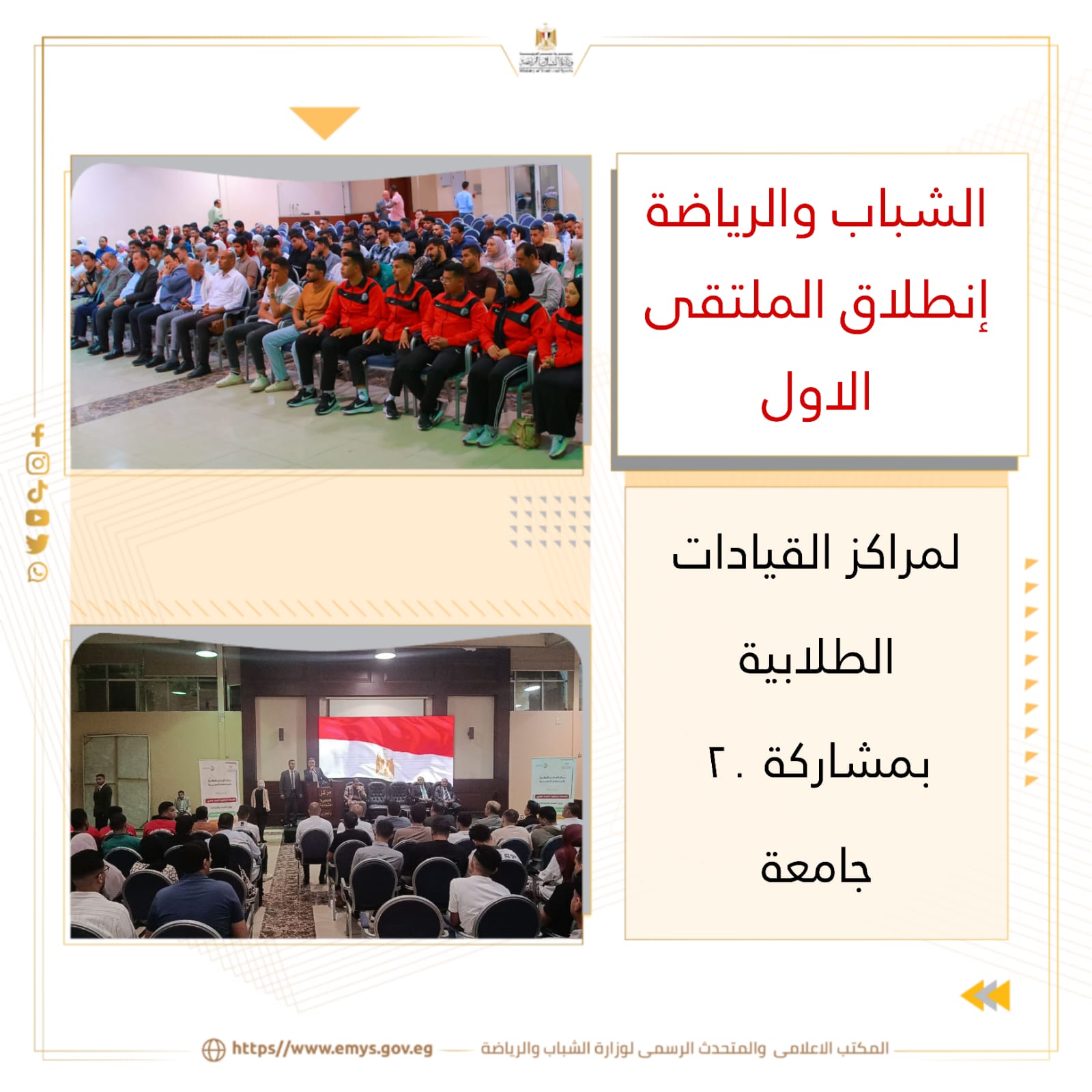 أطلقت وزارة الشباب والرياضة برئاسة الدكتور أشرف صبحي وزير الشباب والرياضة من خلال الإدارة المركزية لتنمية الشباب ـ الإدارة العامة للبرامج والأنشطة الجامعية الملتقى الأول لمراكز القيادات الطلابية بمشاركة ٢٠ جامعة حكومية وخاصة وأهلية وذلك بمركز التنمية الشبابية بالجزيرة والذي تستمر فعالياته حتي ٨ مايو الجاري.