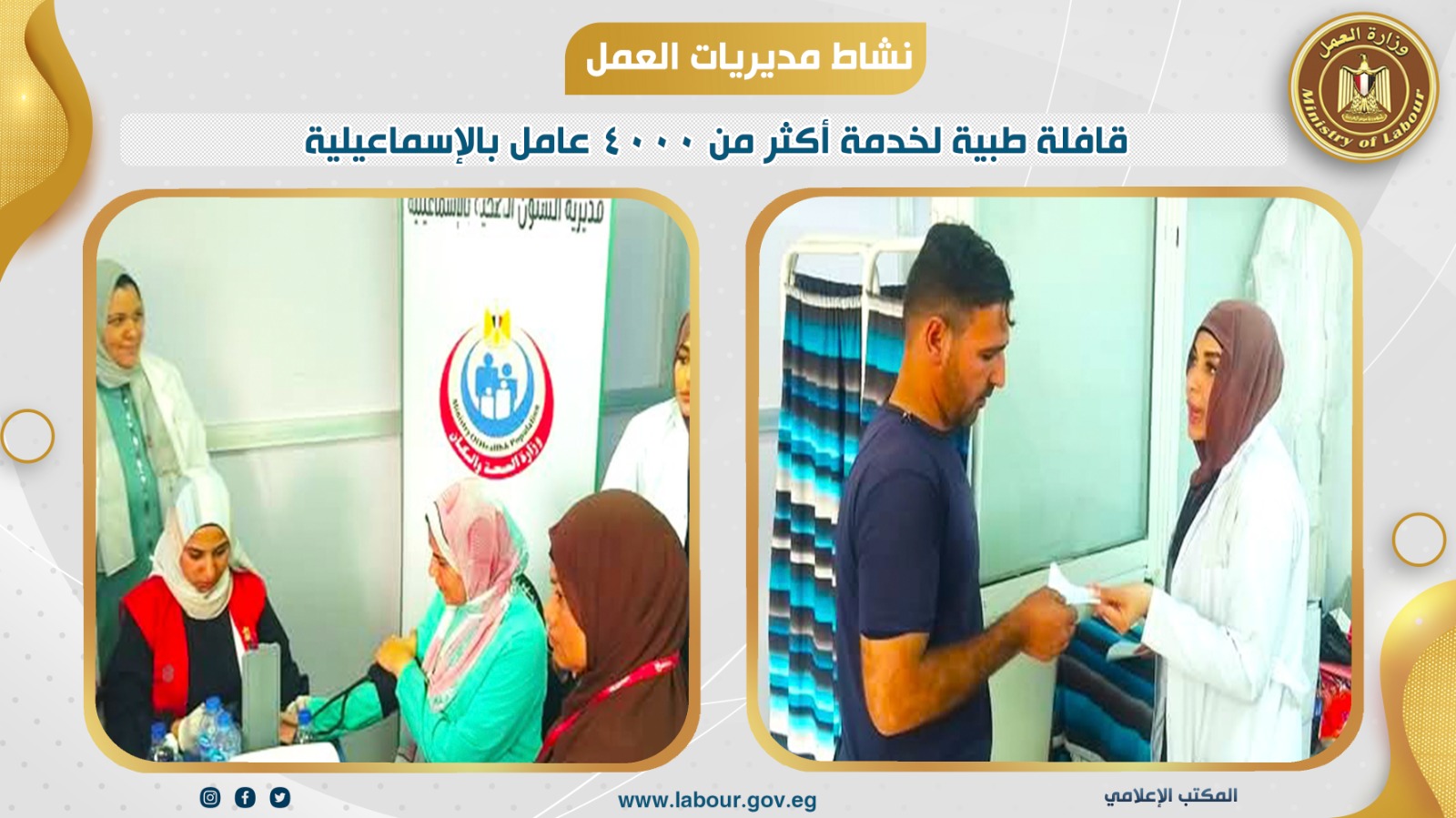 وأوضح حسن رداد مدير المديرية أن القافلة تأتي في إطار احتفالات الدولة بعيد العمال، وتنفيذًا لتوجيهات السيد محمد جبران، وزير العمل، بضرورة الاهتمام بصحة وسلامة العامل المصري، وتفعيل أوجه الرعاية المتكاملة له داخل بيئة العمل، تأكيدًا لمكانة العامل كعنصر أساسي في بناء الجمهورية الجديدة، حيث قدمت القافلة خدمات طبية متكاملة في عدد من التخصصات، شملت (الباطنة، الجلدية، قياس الضغط والسكر، الكشف المبكر عن الأمراض المزمنة، تنظيم الأسرة، بالإضافة إلى أنشطة التوعية الصحية الموجهة للعاملين).شارك في التنظيم من جانب مديرية العمل بالإسماعيلية، سامية عبد السلام مديرة التفتيش العمالي، دعاء السيد مديرة مركز التدريب، حمدي النجار مفتش تفتيش العمل، إبراهيم حلمي مدير العلاقات العامة.