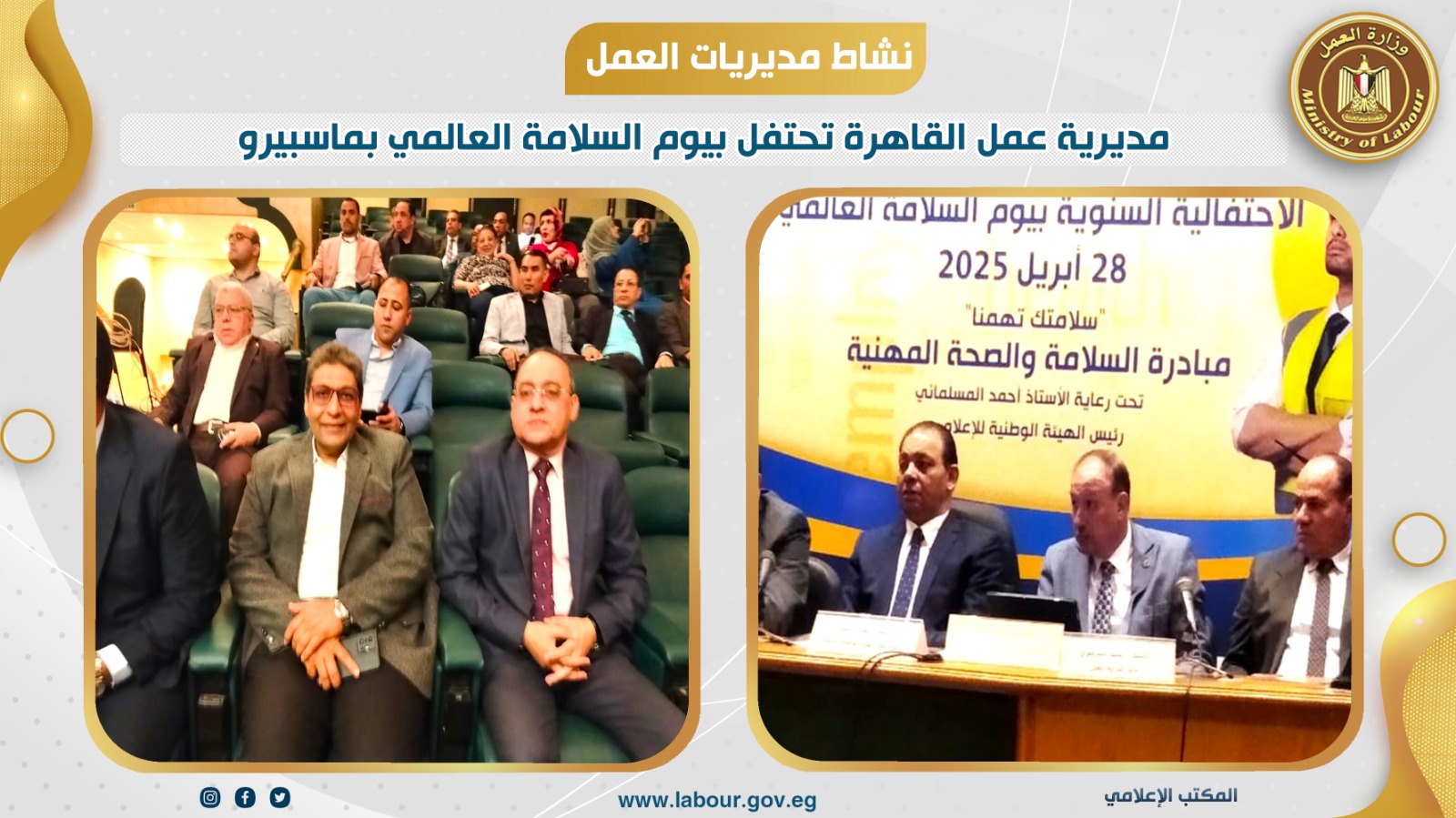 احتفلت مديرية عمل القاهرة بيوم السلامة العالمي، وذلك من خلال مؤتمر السلامة والصحة المهنية الذي نظمتها الهيئة الوطنية للإعلام، بقاعة المؤتمرات الكبرى باتحاد الإذاعة والتليفزيون، بحضور المهندس خالد عبد الله مستشار وزير العمل لقطاع السلامة والصحة المهنية، والسيد الشرقاوي مدير المديرية ،ومجدي لاشين أمين عام الهيئة الوطنية للإعلام نائبا عن السيد أحمد المسلماني رئيس الهيئة الوطنية للإعلام.وأوضح مدير المديرية أن المؤتمر يأتي ضمن جهود المديرية وأجهزتها التابعة لنشر ثقافة السلامة والصحة المهنية بين العاملين بالمنشآت الصحية وأهداف السلامة والصحة المهنية وأهمية خطط الطوارئ بالمنشآت، وذلك تحت إشراف الإدارة المركزية للسلامة والصحة المهنية وتأمين بيئة العمل بالوزارة.