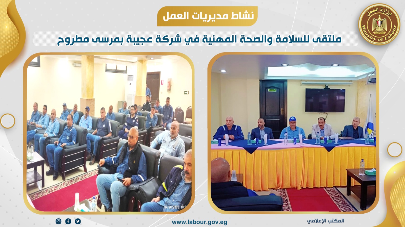 نظمت إدارة السلامة والصحة المهنية بمديرية عمل مطروح، ملتقى للسلامة والصحة المهنية بشركة عجيبة للبترول بحضور 80 عامل من المديرين والعاملين بالشركة وشركات الخدمات الموجودة بالشركة وذلك احتفالاً باليوم العالمي للسلامة والصحة المهنية وتزامناً مع عيد العمال، وتنفيذاً توجيهات الوزير محمد جبران وزير العمل ومتابعة خالد عبد الله مستشار وزير العمل للسلامة والصحة المهنية.وأفاد خالد عبد العزيز مدير المديرية، بأنه تم عقد الملتقى بحقول مليحة التابعة لشركة عجيبة للبترول وتم استعراض مجهودات الشركة والتي تعتبر واحدة من الشركات العملاقة في قطاع البترول والتي تحرص على تأمين بيئة العمل للعاملين وترسيخ أهمية السلامة للحفاظ على الأرواح والممتلكات.وخلال الملتقى ألقى مصطفى جابر "مدير إدارة السلامة والصحة المهنية "كلمة نقل فيها تحيات وزير العمل لجميع عمال مصر وتهنئتهم بعيد العمال وبصدور قانون العمل الجديد الذي يعكس مجهود الوزارة لحماية العمال وتأمين بيئة عمل أمنه والعدالة الاجتماعية وترسيخ الاستقرار الوظيفي في بيئة عمل آمنة ولائقة، مؤكداً على دور السلامة وأهمية اتباع سياسات السلامة لتحقيق أعلى عائد دون إصابات أو حوادث .