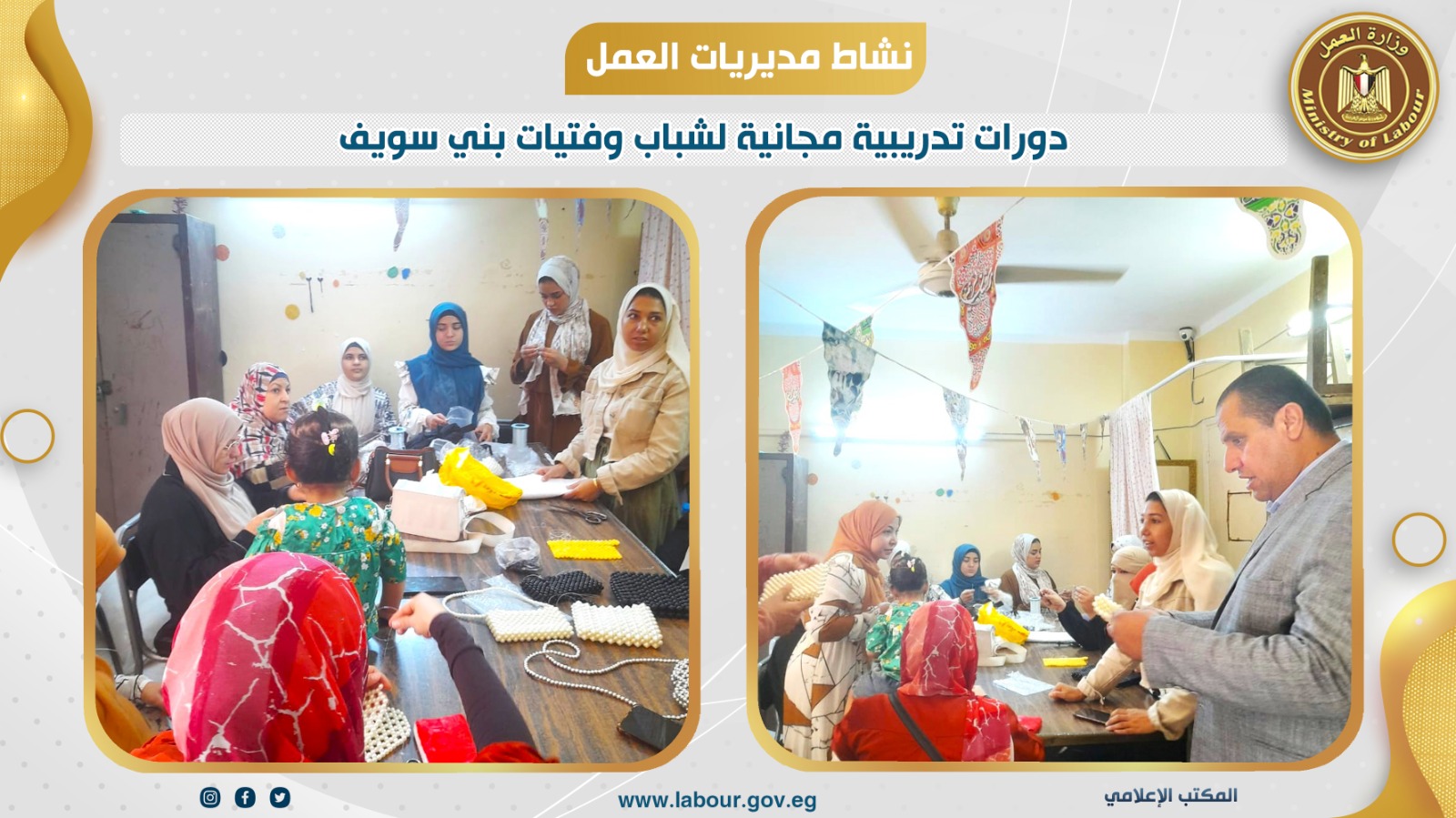 تفقد أحمد معوض مدير مديرية العمل ببني سويف، فعاليات دورة التطريز والمشغولات اليدوية بمقر جمعية تنمية المجتمع المحلي بمدينة بني سويف، والتي يتم تنفيذها في إطار بروتوكول التعاون بين الجمعية ومديرية العمل لعدد 15 متدربة بمقر الجمعية.وأضاف مدير المديرية أن المديرية تنفيذ بمركز التكوين المهني ببني سويف برنامج التفصيل والخياطة لعدد 15 متدربة ضمن الخطة المحلية للتدريب وعدد 15 متدربا في برنامج صيانة وإصلاح أجهزة المحمول بمركز التدريب المهني شرق النيل، وذلك تحت إشراف عامر هاشم محمود مدير إدارة بحوث العمالة والتدريب.