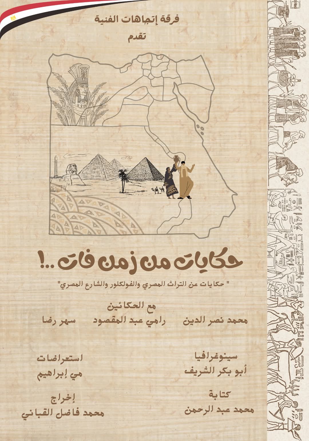 العرض كتابة محمد عبد الرحمن زغلول، وسينوغرافيا الفنان أبو بكر الشريف، واستعراضات الفنانة مي إبراهيم، ومن إخراج محمد فاضل القباني، ويقدّم مجموعة من الحكايات الشعبية المصرية التي تسرد تاريخ مصر وتعكس روح ثقافتها في قالب حكائي ممتع ومتنوع.