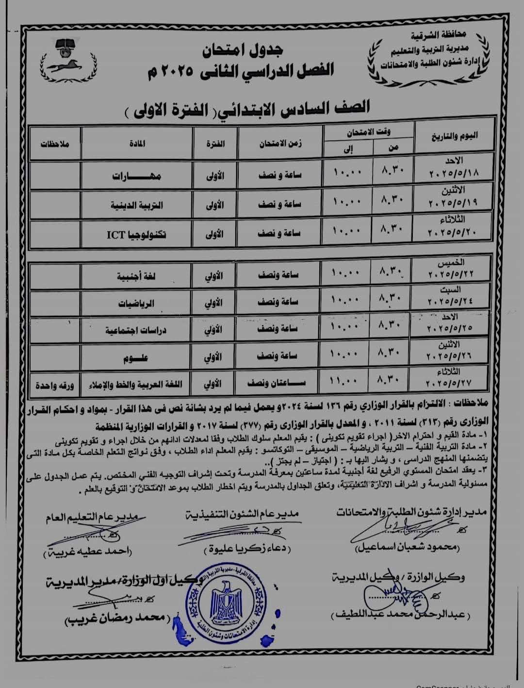 جدول امتحانات الصف السادس الابتدائي 2025 الفصل الدراسي الثاني