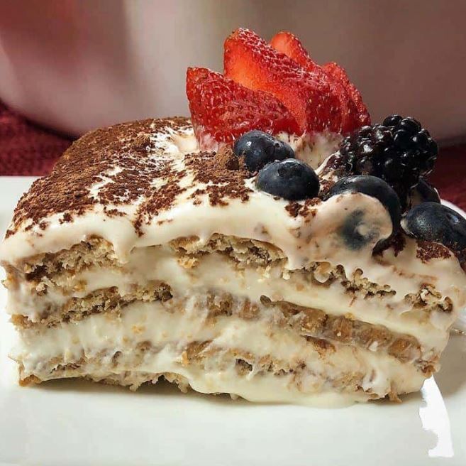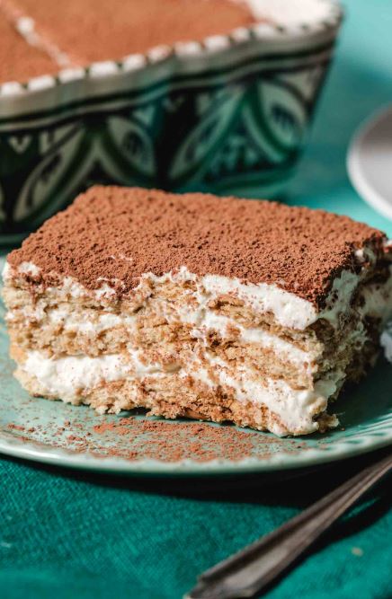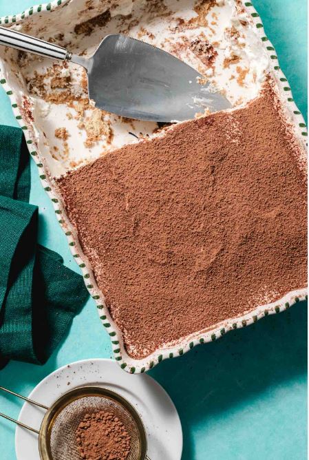 نصب نصف طبقة الكريمة فوق طبقة البسكويت، ثم نعيد رص كمية أخرى من البسكويت بنفس الطريقة السابقة أي بعد غمسها في القهوة، ثم نضيف باقي كمية الكريمة المتبقية وأخيرًا نضيف طبقة من البسكويت على الوجه.