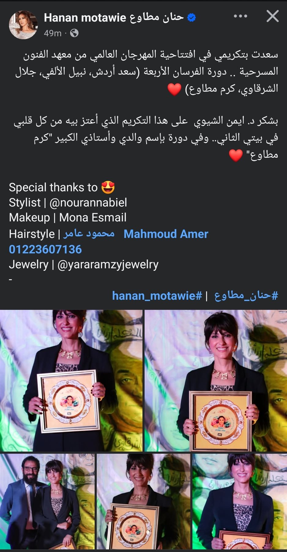 ونشرت الفنانة حنان مطاوع، على صفحتها الرسمية لموقع التواصل الاجتماعي الفيسبوك، وقالت: "سعدت بتكريمي في افتتاحية المهرجان العالمي من معهد الفنون المسرحية، دورة الفرسان الأربعة (سعد أردش، نبيل الألفي، جلال الشرقاوي، كرم مطاوع) .
