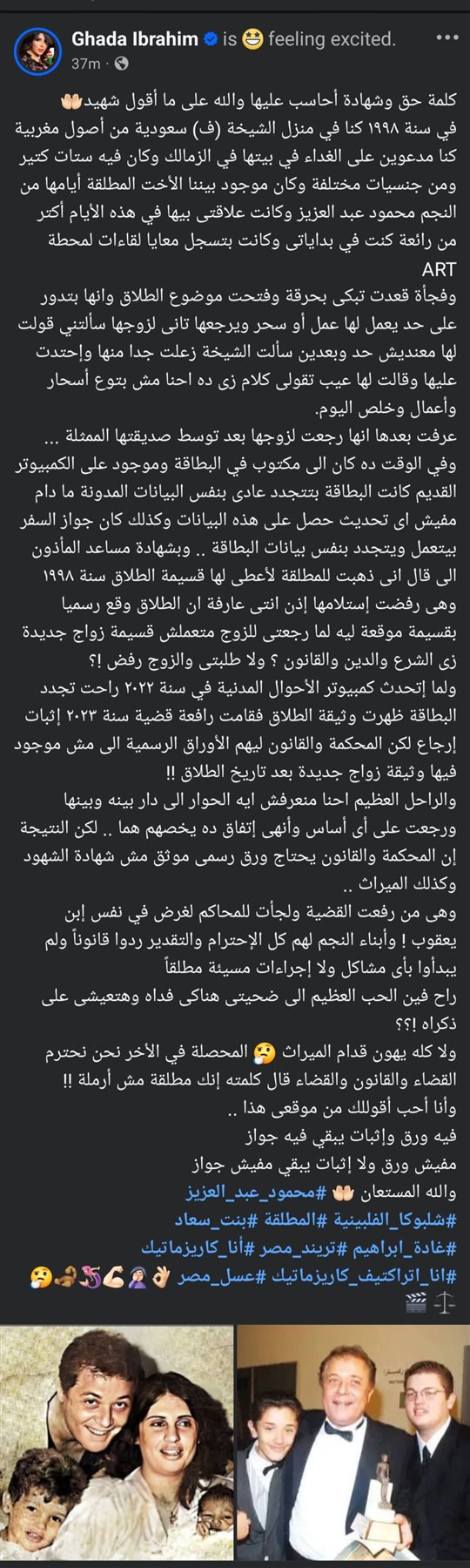 وتابعت: “عرفت بعدها انها رجعت لزوجها بعد توسط صديقتها الممثلة ... وفي الوقت ده كان الى مكتوب في البطاقة وموجود على الكمبيوتر القديم كانت البطاقة بتتجدد عادى بنفس البيانات المدونة ما دام مفيش اى تحديث حصل على هذه البيانات وكذلك كان جواز السفر بيتعمل ويتجدد بنفس بيانات البطاقة .. وبشهادة مساعد المأذون الى قال انى ذهبت للمطلقة لأعطى لها قسيمة الطلاق سنة ١٩٩٨ وهى رفضت إستلامها إذن انتى عارفة ان الطلاق وقع رسميا بقسيمة موقعة ليه لما رجعتى للزوج متعملش قسيمة زواج جديدة زى الشرع والدين والقانون ؟ ولا طلبتى والزوج رفض !؟”.