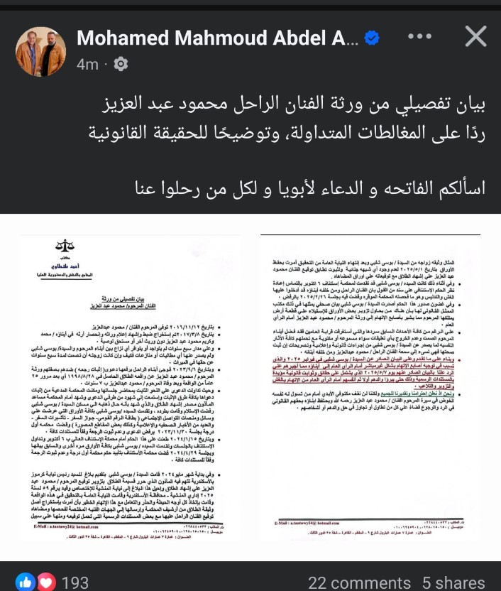 ونشر محمد محمود عبد العزيز على موقع التواصل الاجتماعي الفيسبوك، بيانا تفصيليا، وكتب: " بيان تفصيلي من ورثة الفنان الراحل محمود عبد العزيز، ردًا على المغالطات المتداولة، وتوضيحًا للحقيقة القانونية، اسألكم الفاتحه و الدعاء لأبويا و لكل من رحلوا عنا".