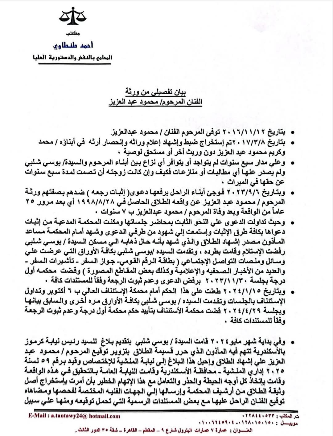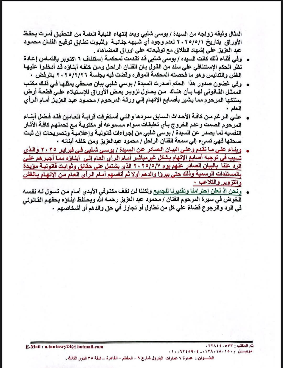 وبناء على ما تقدم وعلى البيان الصادر عن السيدة / بوسي شلبي في فبراير ۲۰۲٥ والذي تسبب في توجيه أصابع الاتهام بشكل غير مباشر أمام الرأى العام إلى أبناؤه مما أجبرهم على الرد علنا بالبيان الصادر عنهم يوم ٢٠٢٥/٥/٧ الذي يشتمل على حقائق وثوابت قانونية مؤيدة بالمستندات الرسمية وذلك حتى يبرؤا والدهم أولا ثم أنفسهم أمام الرأى العام من الإتهام بالغش والتزوير والتلاعب .