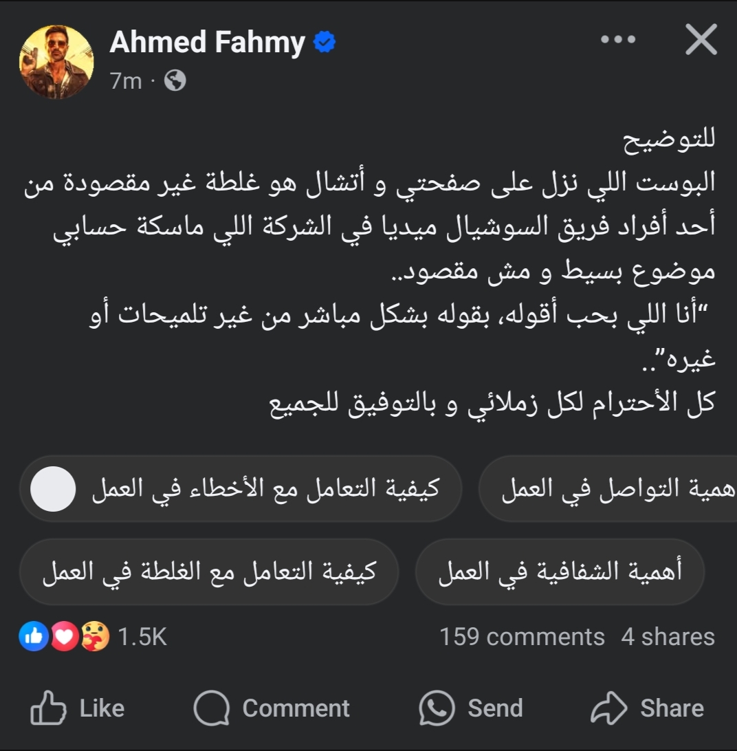 وكتب على صفحته الرسمية على موقع التواصل الاجتماعي الفيسبوك: "للتوضيح البوست اللي نزل على صفحتي وأتشال هو غلطة غير مقصودة من أحد أفراد فريق السوشيال ميديا في الشركة اللي ماسكة حسابي، موضوع بسيط و مش مقصود".