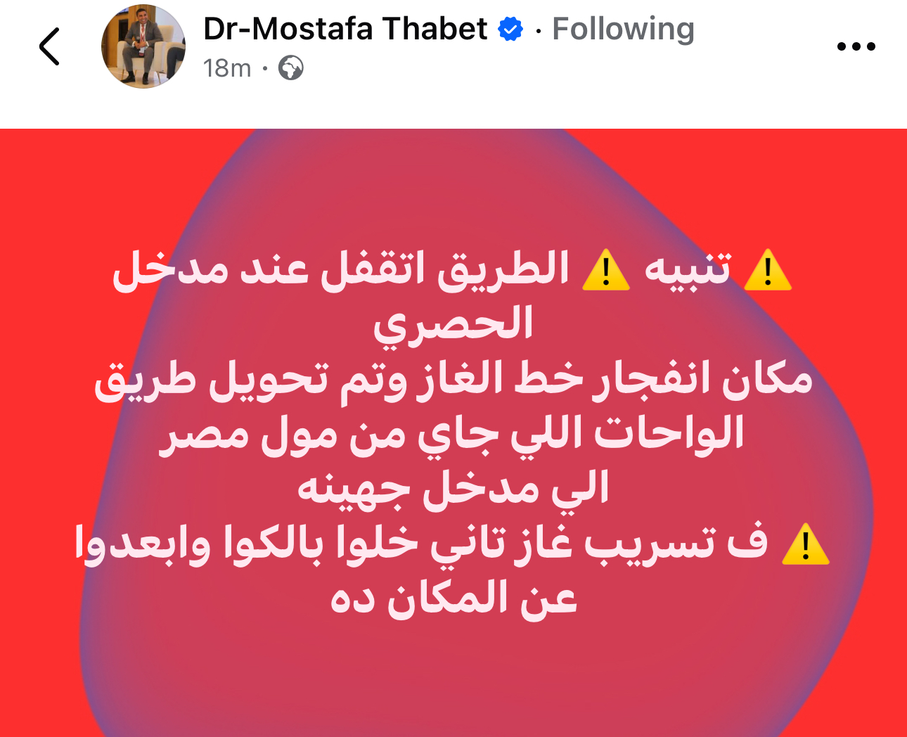 وقال عبر صفحته الشخصية على موقع التواصل الاجتماعي فيس بوك،"تنبيه..الطريق اتقفل عند مدخل الحصري مكان انفجار خط الغاز وتم تحويل طريق الواحات اللي جاي من مول مصر الي مدخل جهينه في تسريب غاز تاني خلوا بالكوا وابعدوا عن المكان ده".