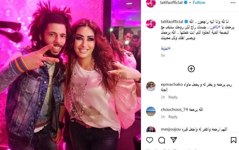 ونشرت لطيفة صورة تجمعها بالمطرب عبر صفحتها الرسمية "إنستجرام" وكتبت " انا لله وانا اليه راچعون .. الله يرحمك يا #كافون .. چسدك راح لكن روحك ستبقى مع البصمة الفنية الحلوة اللي انت عملتها .. الله يرحمك ويصبر اهلك وكل محبينك".