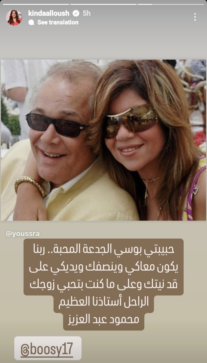 وكتبت كندة عبر خاصية الاستوري على صفحتها الرسمية "إنستجرام" " حبيبتي بوسي الجدعة المحبة.. ربنا يكون معاكي وينصفك ويديكي على قد نيتك وعلى ما كنتِ تحبي زوجك الراحل أستاذنا العظيم محمود عبدالعزيز".