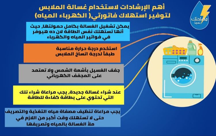 استعمال المياه الباردة أن أمكن لان المياة الساخنة يستهلك 95 % من استهلاك الغسالة .