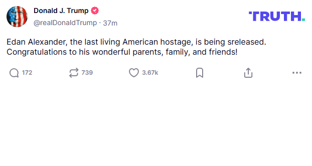 وكتب ترامب: "إيدان ألكسندر، آخر رهينة أمريكي على قيد الحياة، يُطلق سراحه، تهانينا لوالديه الرائعين وعائلته وأصدقائه!