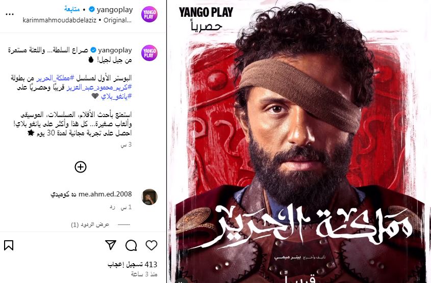 طرحت منصة يانجو بلاي البوستر الأول لمسلسل "مملكة الحرير بطولة النجم كريم محمود عبد العزيز والمقرر عرضه قريبآ حصريآ عبر منصتها.