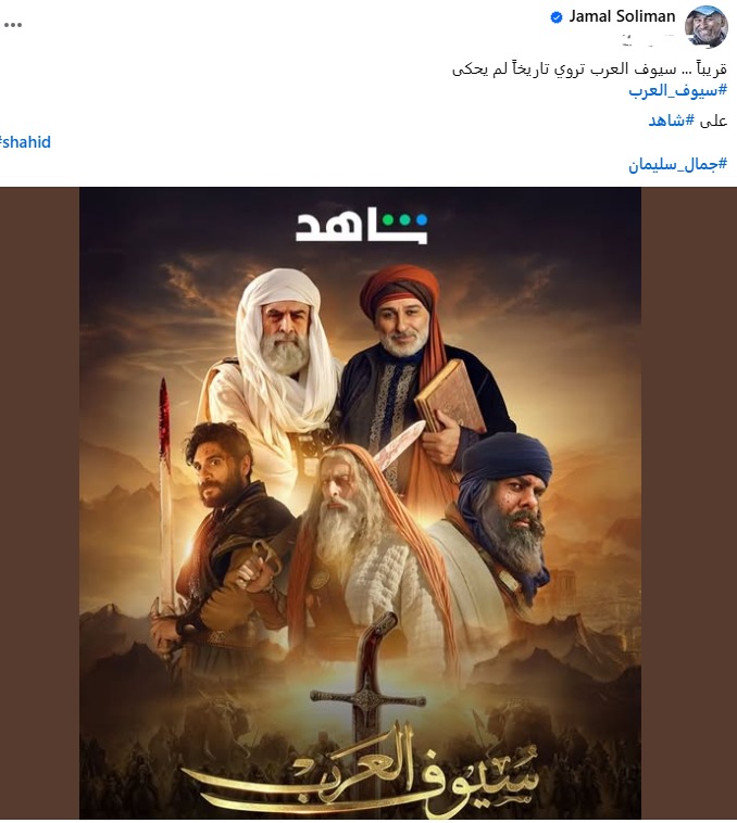 وكتب الفنان جمال سليمان على صفحته الرسمية على موقع التواصل الاجتماعي الفيسبوك: "قريبا، سيوف العرب تروى تاريخيا لم يحكى".