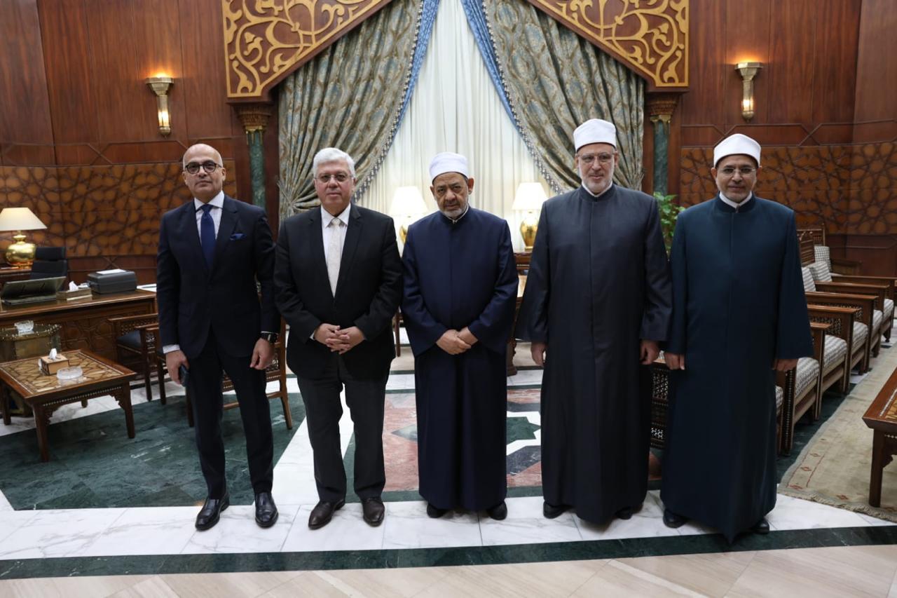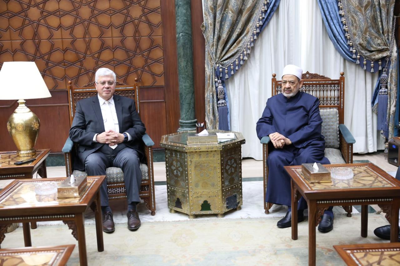 استقبل فضيلة الإمام الأكبر الدكتور أحمد الطيب، شيخ الأزهر الشريف، الدكتور محمد أيمن عاشور، وزير التعليم العالي والبحث العلمي، بحضور فضيلة الدكتور محمد الضويني، وكيل الأزهر، وفضيلة الدكتور سلامة داود، رئيس جامعة الأزهر، والدكتور محمد ضياء زين العابدين، رئيس جامعة عين شمس، وذلك بمقر مشيخة الأزهر.