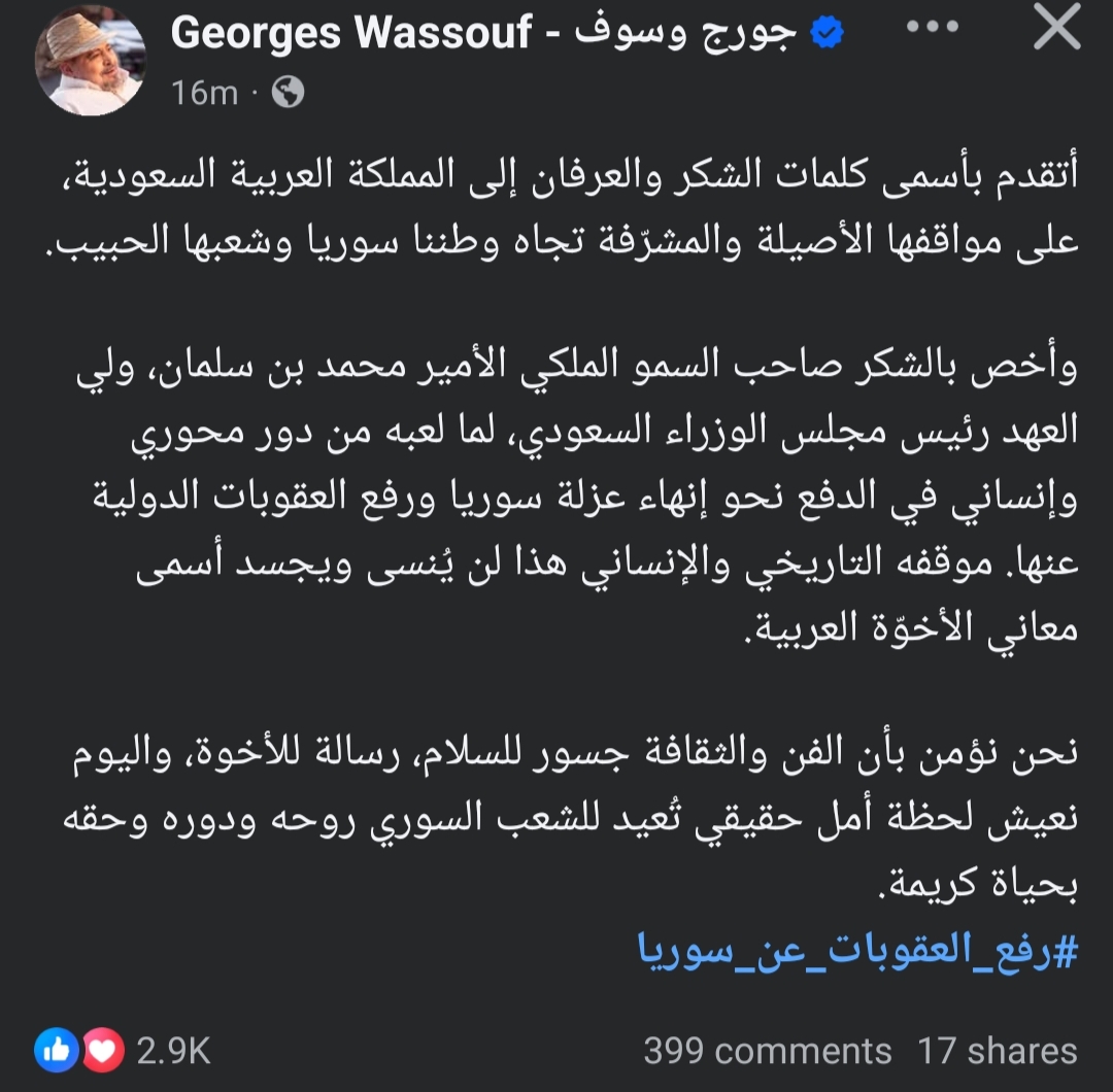 كتب جورج وسوف في حسابه الرسمي على موقع التواصل الاجتماعي الفيسبوك: " أتقدم بأسمى كلمات الشكر والعرفان إلى المملكة العربية السعودية، على مواقفها الأصيلة والمشرّفة تجاه وطننا سوريا وشعبها الحبيب".