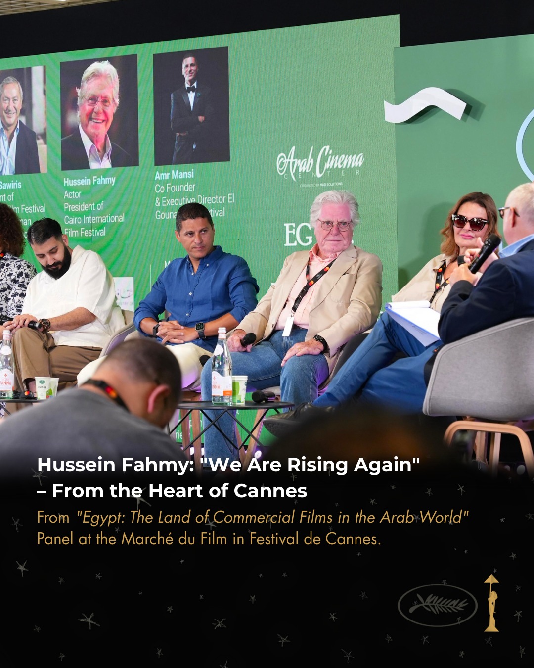 ضمن المشاركة الاستثنائية لمهرجان القاهرة السينمائي الدولي في فعاليات الدورة الـ78 لمهرجان كان السينمائي الدولي، شارك الفنان الكبير حسين فهمي، رئيس مهرجان القاهرة، اليوم في جلسة نقاشية بارزة بعنوان "مصر: دولة الأفلام الجماهيرية في العالم العربي"، والتي أقيمت على المسرح الرئيسي بقصر المهرجانات.