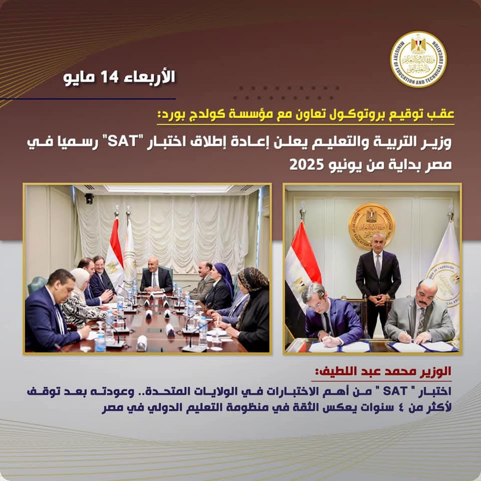 ويأتي توقيع هذا البروتوكول في إطار رؤية وزارة التربية والتعليم لتطوير منظومة التعليم ما قبل الجامعي، وتعزيز برامج الاستعداد الجامعي المعترف بها عالميًا، وعلى رأسها إعادة تقديم اختبار SAT في مصر بداية من شهر يونيو المقبل.