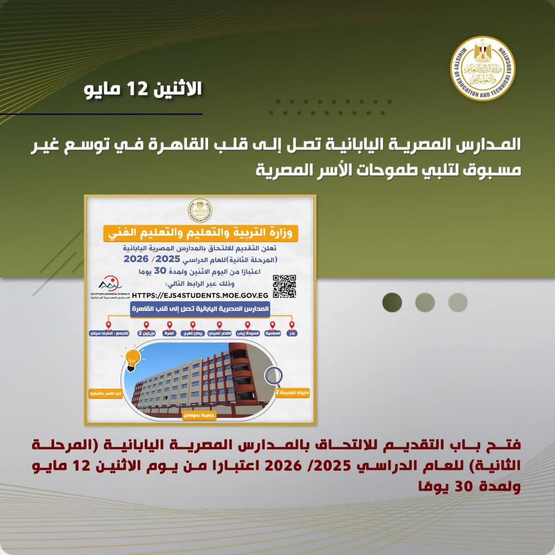 في إطار النجاحات الملموسة التي حققتها المدارس المصرية اليابانية ضمن الرؤية الشاملة للدولة لتطوير منظومة التعليم المصري، تعلن وزارة التربية والتعليم والتعليم الفني عن فتح باب التقديم للالتحاق بالمدارس المصرية اليابانية (المرحلة الثانية) للعام الدراسي 2025/ 2026، في ١١ مدرسة جديدة تدخل الخدمة بداية من سبتمبر 2025، ليرتفع بذلك إجمالي عدد المدارس إلى ٦٩ مدرسة موزعة على مختلف محافظات الجمهورية، بالإضافة إلى إتاحة التقديم في عدد من المدارس القائمة التي لا تزال تضم أماكن شاغرة.