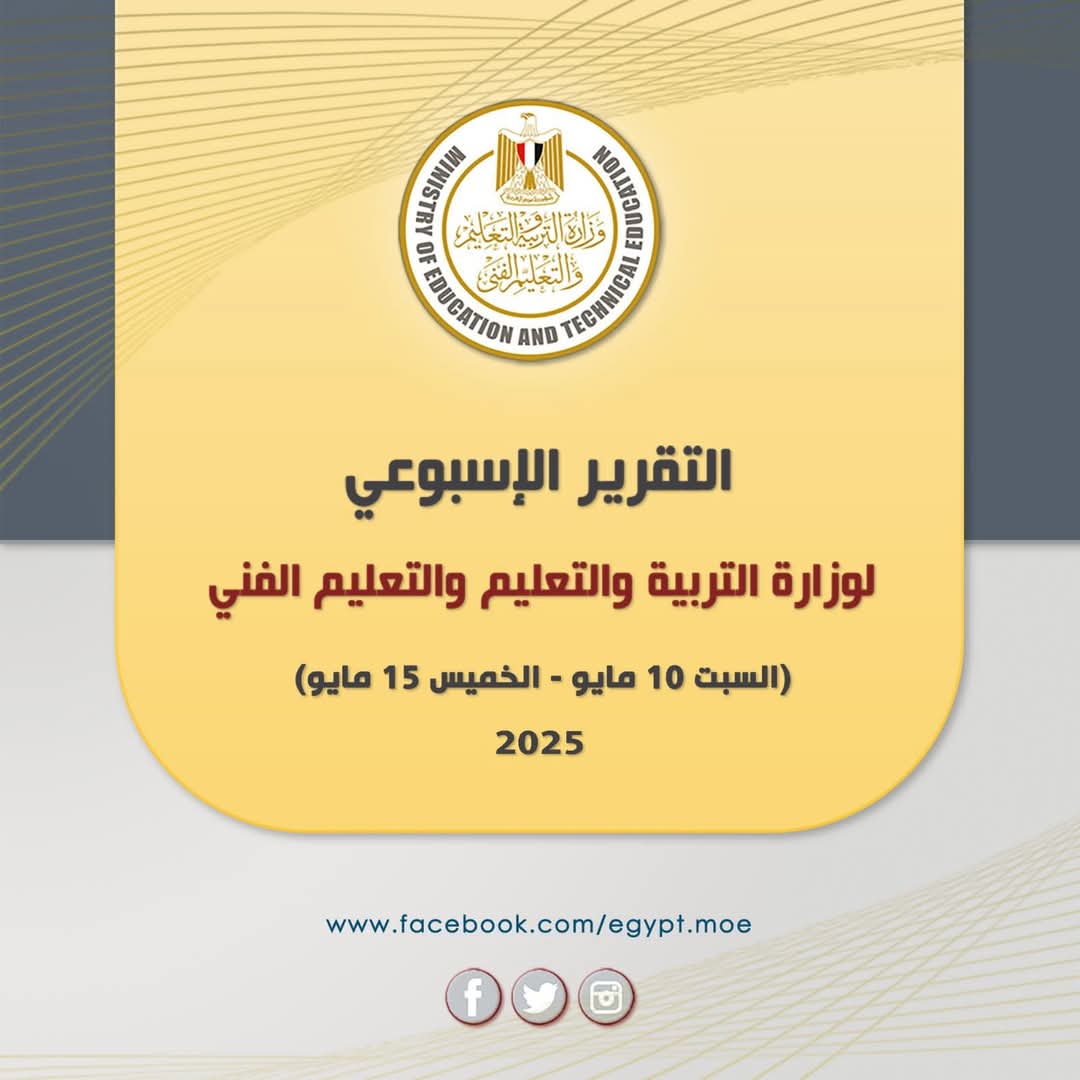 أصدر المركز الإعلامي لوزارة التبية والتعليم والتعليم الفني التقرير الأسبوعي للوزارة خلال الفترة من (السبت ١٠ مايو - الخميس ١٥ مايو ٢٠٢٥) ويتضمن ما يلى :