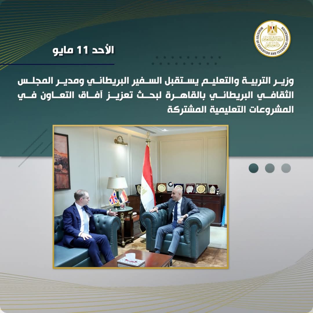 استقبل السيد محمد عبد اللطيف وزير التربية والتعليم والتعليم الفني، كلًا من السيد جاريث بايلي السفير البريطاني لدى القاهرة، والسيد مارك هوارد مدير المجلس الثقافي البريطاني في مصر؛ لبحث تعزيز آفاق التعاون في المشروعات التعليمية المشتركة.