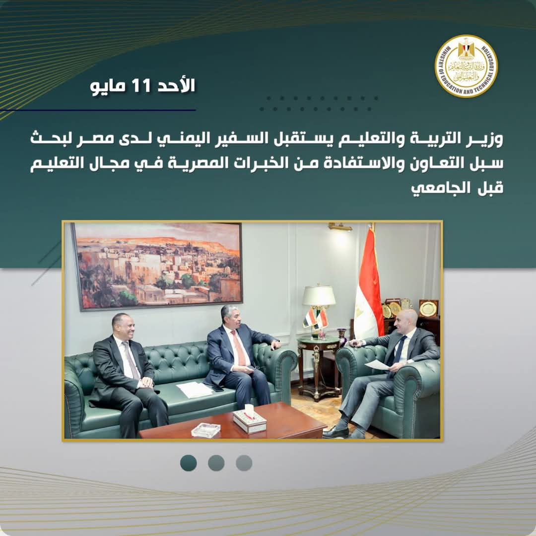 وتناول اللقاء كذلك مناقشة تطوير وتحديث بروتوكول التعاون القائم بشأن البرنامج التنفيذي للتعاون التربوي، بهدف تحسين آليات التنفيذ وتعزيز التنسيق بين المؤسسات التعليمية في البلدين، فضلا عن تفعيل برامج التعاون في مجال التعليم الفني والتدريب المهني، من خلال برنامج تنفيذى للتعاون يتيح نقل التجارب المصرية في هذا المجال، وتطوير برامج مشتركة تساهم في إعداد جيل من الكفاءات المهنية اليمنية المؤهلة لسوق العمل.
