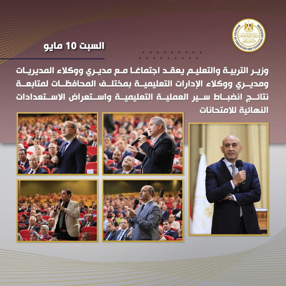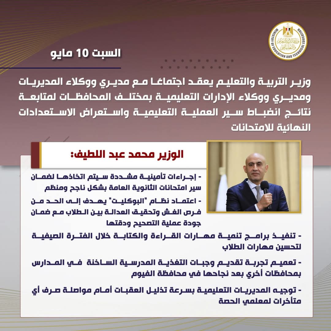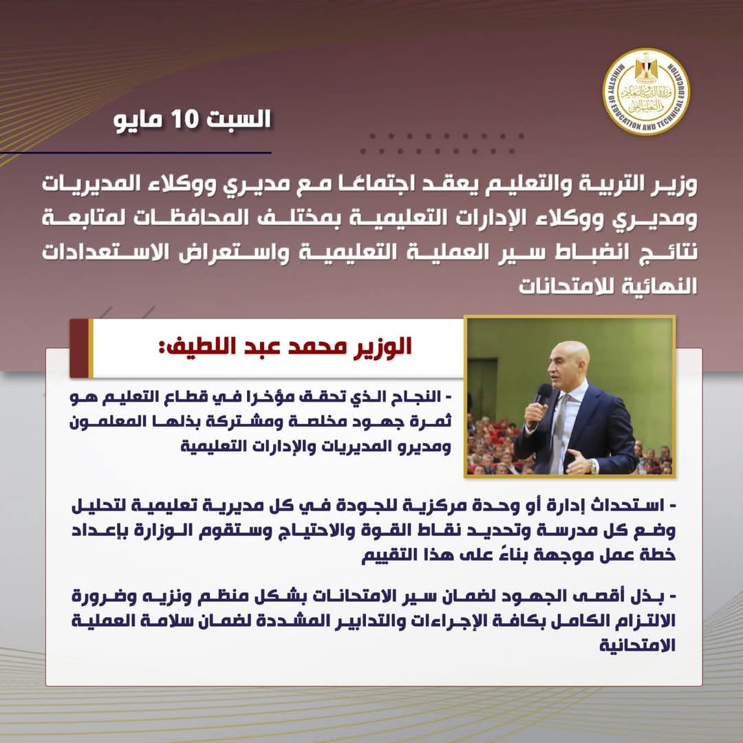 عقد السيد محمد عبد اللطيف وزير التربية والتعليم والتعليم الفني اجتماعًا مع مديرى ووكلاء المديريات ومديرى ووكلاء الإدارات التعليمية بجميع المحافظات؛ وذلك لمتابعة نتائج انضباط سير العملية التعليمية على مستوى الجمهورية واستعراض الإجراءات التنفيذية والاستعدادات النهائية المتعلقة بامتحانات العام الدراسى الحالى ٢٠٢٤/ ٢٠٢٥، والتأكيد على تنفيذ التعليمات والإجراءات المنظمة للعملية الامتحانية.