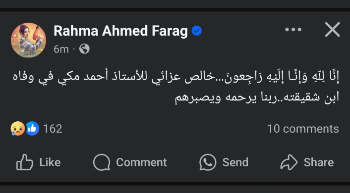 ونشرت رحمة أحمد عبر حسابها الرسمي عبر موقع التواصل الاجتماعي الفيسبوك: "إنا لِلَّهِ وَإِنَّا إِلَيْهِ رَاجِعونَ... خالص عزائي للأستاذ أحمد مكي في وفاه ابن شقيقته، ربنا يرحمه ويصبرهم".
