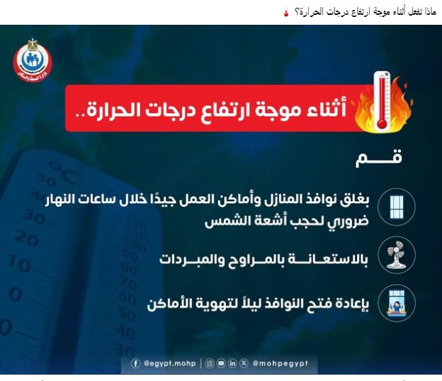 كما كانت أعلنت وزارة الصحة والسكان بعض الإرشادات التي يجب اتباعها عند ارتفاع درجات الحرارة وهي :