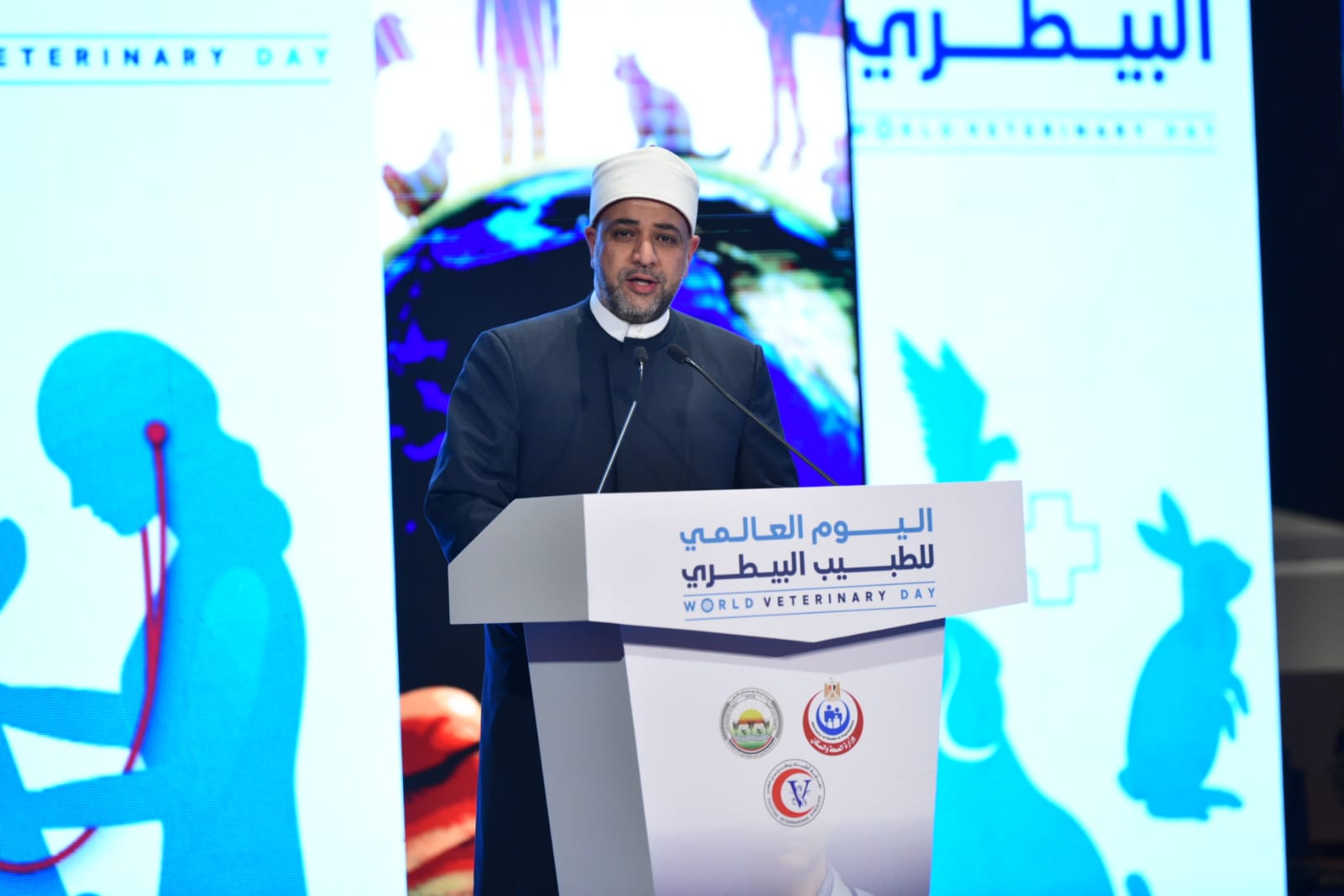 وفي كلمة، الدكتور أسامة الأزهري، وزير الأوقاف، التي ألقاها نيابةً عنه، الدكتور أيمن أبو عمر، وكيل الوزارة لشئون الدعوى، أن مهنة الطبيب البيطري أساسية جدا للحفاظ على الصحة العامة فهي تجسد معني الرحمة، والإحسان، فالحيوان ليس كائن مهمش في القران الكريم، ولكن في خلقه حكمة، وله حضور رمزي، ومعنوي، في سور القرآن الكريم، فالحيوان كائن له دلالاته وفاعليته في التوازن البيئي، مستشهدًا بالآية الكريمة، {وَما مِنْ دَابَّةٍ فِي الْأَرْضِ وَلا طائِرٍ يَطِيرُ بِجَناحَيْهِ إِلاَّ أُمَمٌ أَمْثالُكُمْ} فالطبيب البيطري ليس مجرد مختص، أو خبير بل هو ركيزة أساسية لحماية الأمن الغذائي، وتأمين الثروة الحيوانية، ورسالة إنسانية، فمن رحم الحيوان رحمه الرحمن، ومن تعدى على الحيوان فقد أساء لمعنى الإنسانية، لذلك تؤمن وزارة الأوقاف أن بناء الوعي لا يكتمل إلا إذا أحُسن تكريم أصحاب الرسالات الإنسانية غير الناطقة.