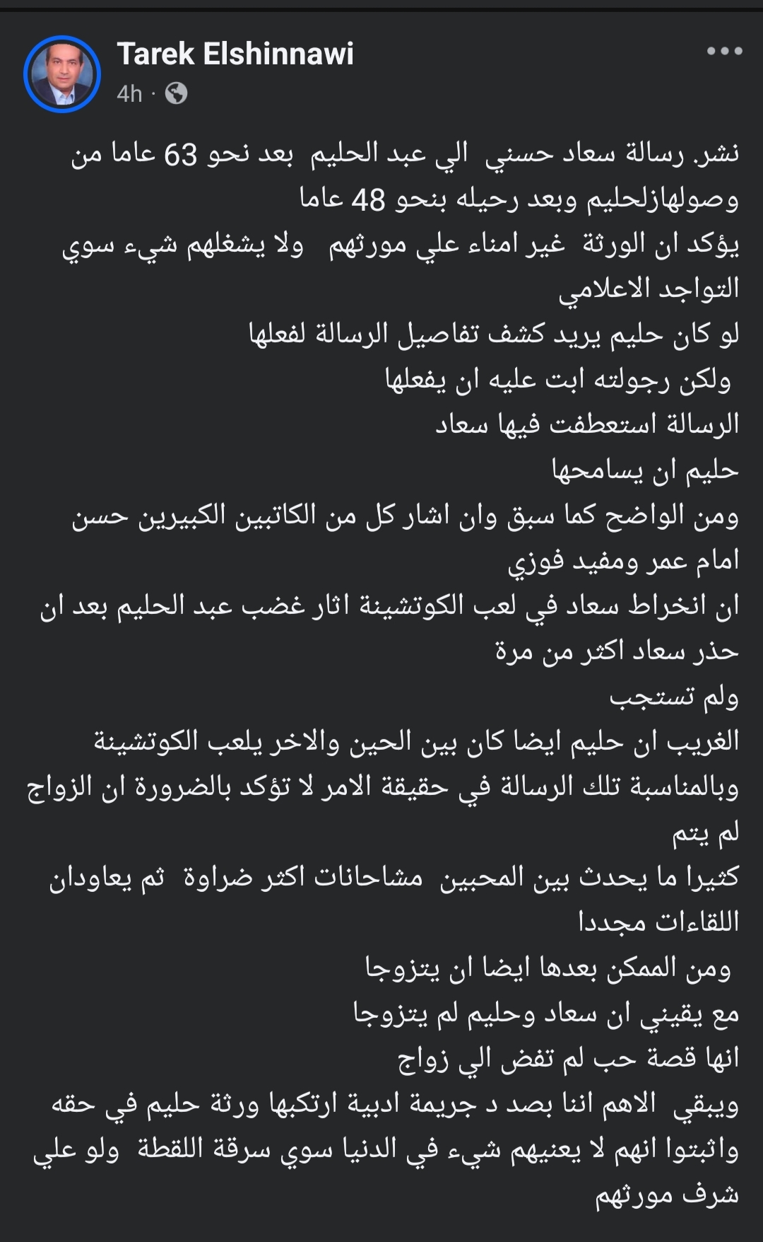 وتابع الشناوي من خلال منشوره: "ولكن رجولته أبت عليه أن يفعلها الرسالة استعطفت فيها سعاد حليم ان يسامحها ومن الواضح كما سبق وان اشار كل من الكاتبين الكبيرين حسن امام عمر ومفيد فوزي".