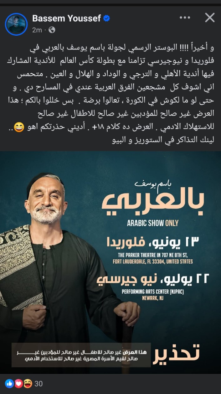 نشر الإعلامي باسم يوسف البوستر الرسمي لجولة باسم يوسف بالعربي في فلوريدا ونيوجيرسي تزامنا مع بطولة كأس العالم للأندية، وجاء ذلك بعد ماتم تداوله عن إلغاء العرض المسرحي الجديد الذي من المفترض أن يقدّمه في 13 يونيو المقبل في ميامي بأميركا.