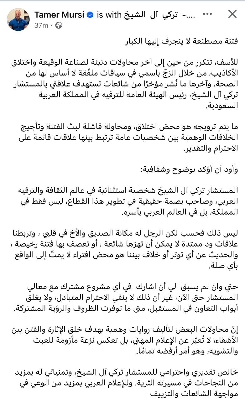 نشر المنتج تامر مرسي بيانا قبل قليل، رد فيه بشأن ما تردد من إشاعات حول علاقته بالمستشار تركي آل الشيخ، رئيس الهيئة العامة للترفيه في المملكة العربية السعودية، وذلك يعد ما تم تداوله خلال الساعات الماضية تزعم وجود خلافات بينهما.