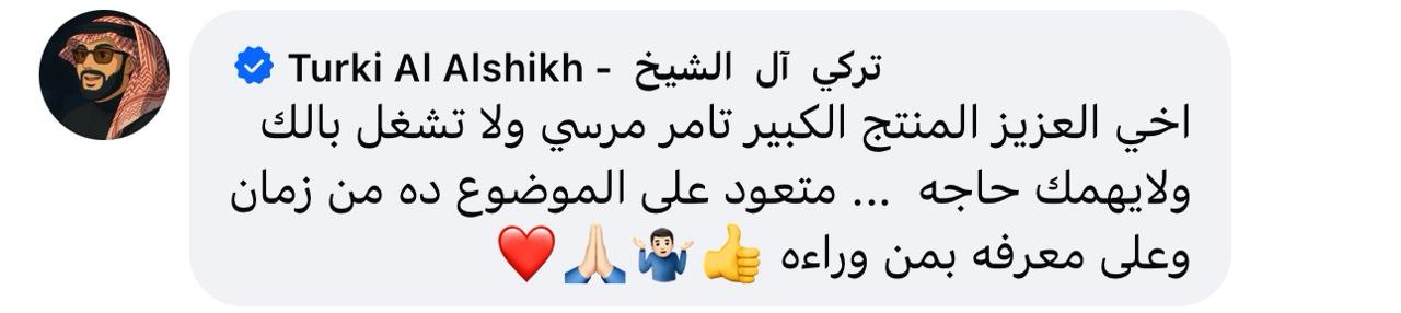 ويرد عليه بالمستشار تركي آل الشيخ، رئيس الهيئة العامة للترفيه في المملكة العربية السعودية: “أخي العزيز المنتج الكبير تامر مرسي ولا تشغل بالك ولا يهمك حاجه متعود على الموضوع ده من زمان، وعلى معرفه بمن وراءه”.