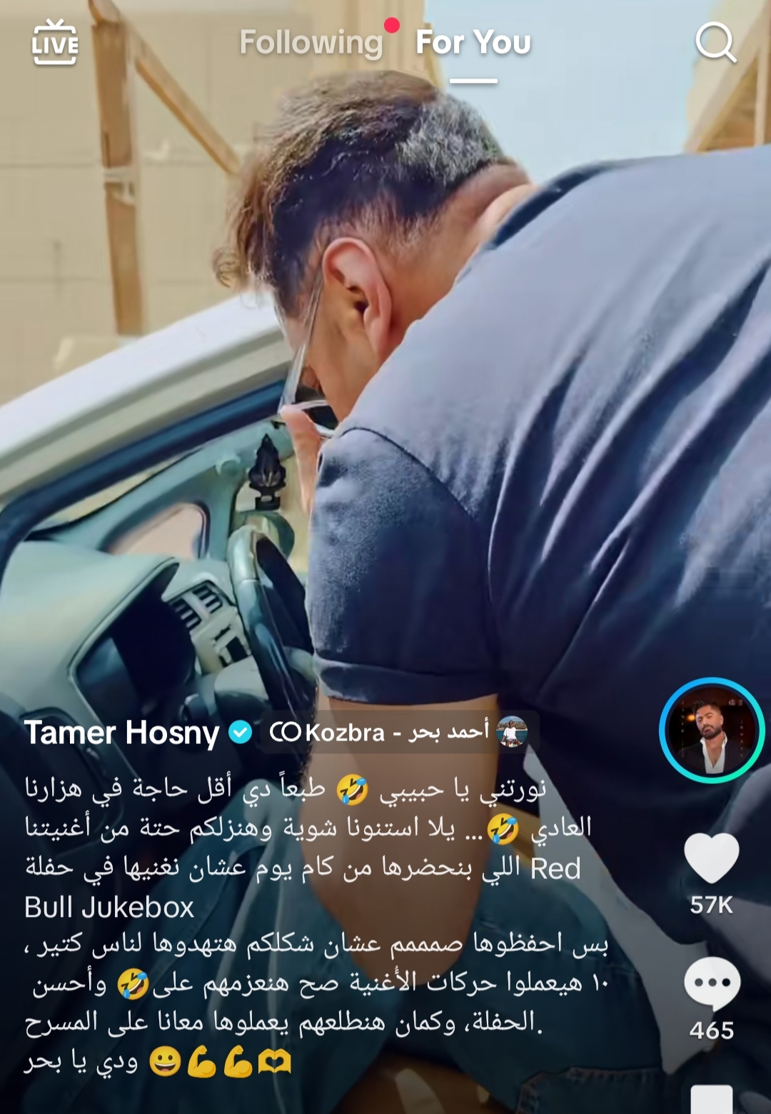 ونشر تامر حسني مقطع فيديو له عبر حسابه الرسمي بموقع التيك توك، يجمعه مع كزبرة وبطريقة طريقه من كواليس التحضير للأغنية، وكتب: "نورتني يا حبيبي.. طبعا دي أقل حاجة في هزارنا العادي.. يلا استنونا شوية وهنزلكم حتة من أغنيتنا اللي بنحضرها من كام يوم عشان نغنيها في حفلة RedBull Jukebox، بس احفظوها صم عشان شكلكم هتهدوها لناس كتير.. وأحسن 10 هيعملوا حركات الأغنية صح هنعزمهم على الحفلة، وكمان هنطلعهم يعملوها معانا على المسرح.. ودي يا بحر".