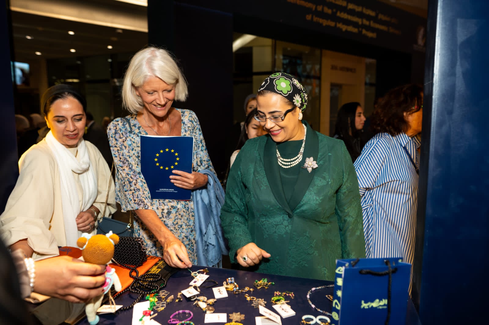 وفي كلمتها توجهت آن كوفود بالشكر إلى المجلس القومي للمرأة لتعاونه الفاعل مع الاتحاد الأوروبي خلال مشروع "معالجة الدوافع الاقتصادية للهجرة غير الشرعية " وذلك عبر توفير التدريب والمهارات اللازمة من أجل دعم دخولهن في سوق العمل،فتم التركيز على تعليمهن مهارات التسويق والتصوير الفوتوغرافي إلى جانب تعليمهن المنتجات اليدوية المختلفة.