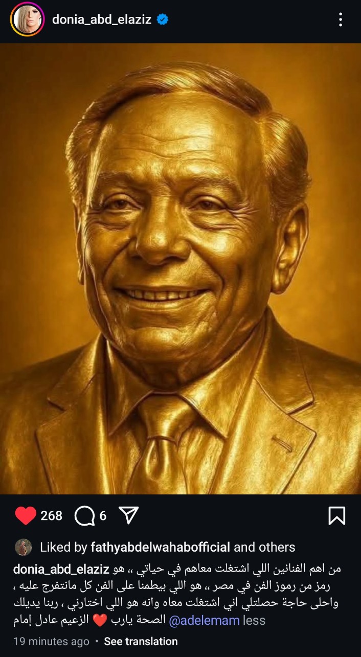 نشرت دنيا عبد العزيز على موقع التواصل الاجتماعي لتبادل الصور والفيديوهات الانستجرام: "من أهم الفنانين اللي اشتغلت معاهم في حياتي رمز من رموز الفن في مصر، هو اللي بيطمنا على الفن كل ما نتفرج عليه، واحلى حاجة حصلتلي اني اشتغلت معاه وانه هو اللي اختارني، ربنا يديلك الصحة يارب الزعيم عادل إمام".