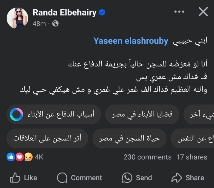 نشرت راندا البحيري عبر صفحتها الرسمية في موقع التواصل الاجتماعي: "ابني حبيبي ياسين، أنا لو مُعرَضَه للسجن حالياً بجريمة الدفاع عنك، ف فداك مش عمري بس، والله العظيم فداك الف عُمر علي عُمري و مش هيكفي حبي ليك".
