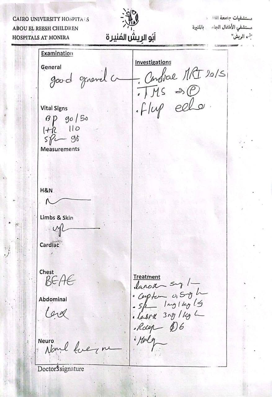 وتابعت إحدى أقاربها في منشور لها على الفيسبوك "عليا قعدت في رعاية مستشفى أبو الريش اسبوع، لحد ما كفاءة القلب وصلت ٢٠٪، الحد الأدنى لعمرها ٥٥٪، وخرجت الحمد لله، بس الدكاترة قالوا محتاجة تدخل جراحي سريع لأن حالتها حرجة جدا، محتاجة زرع قلب".