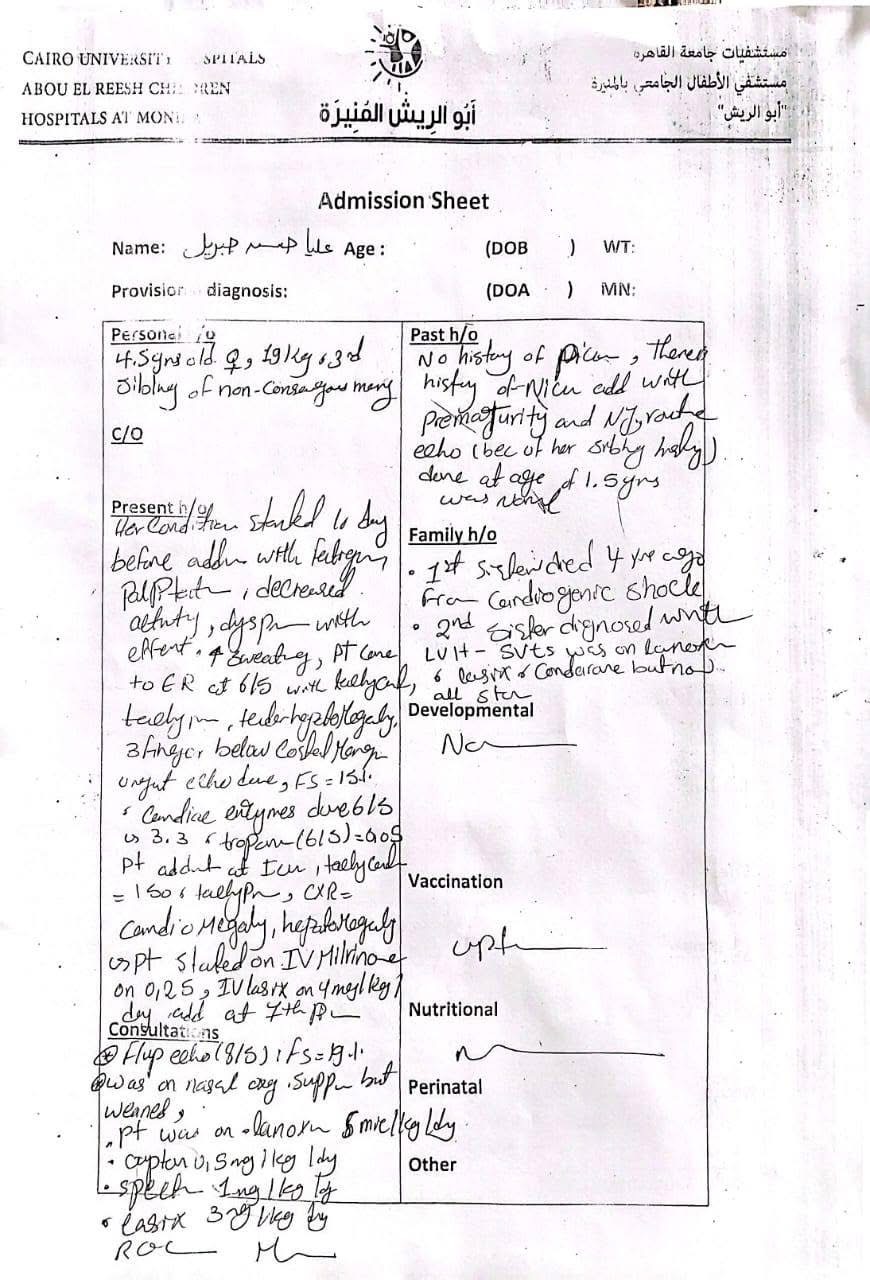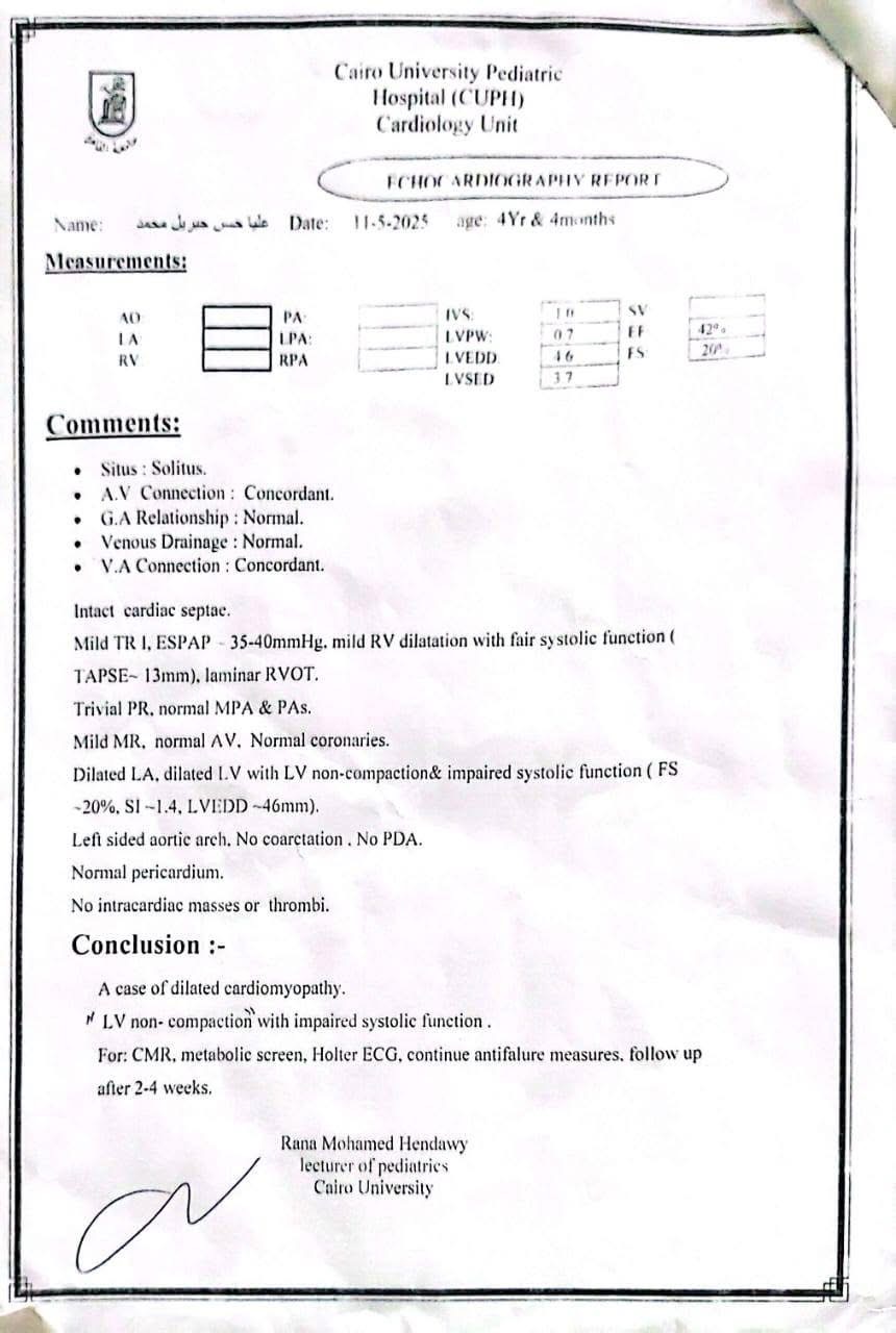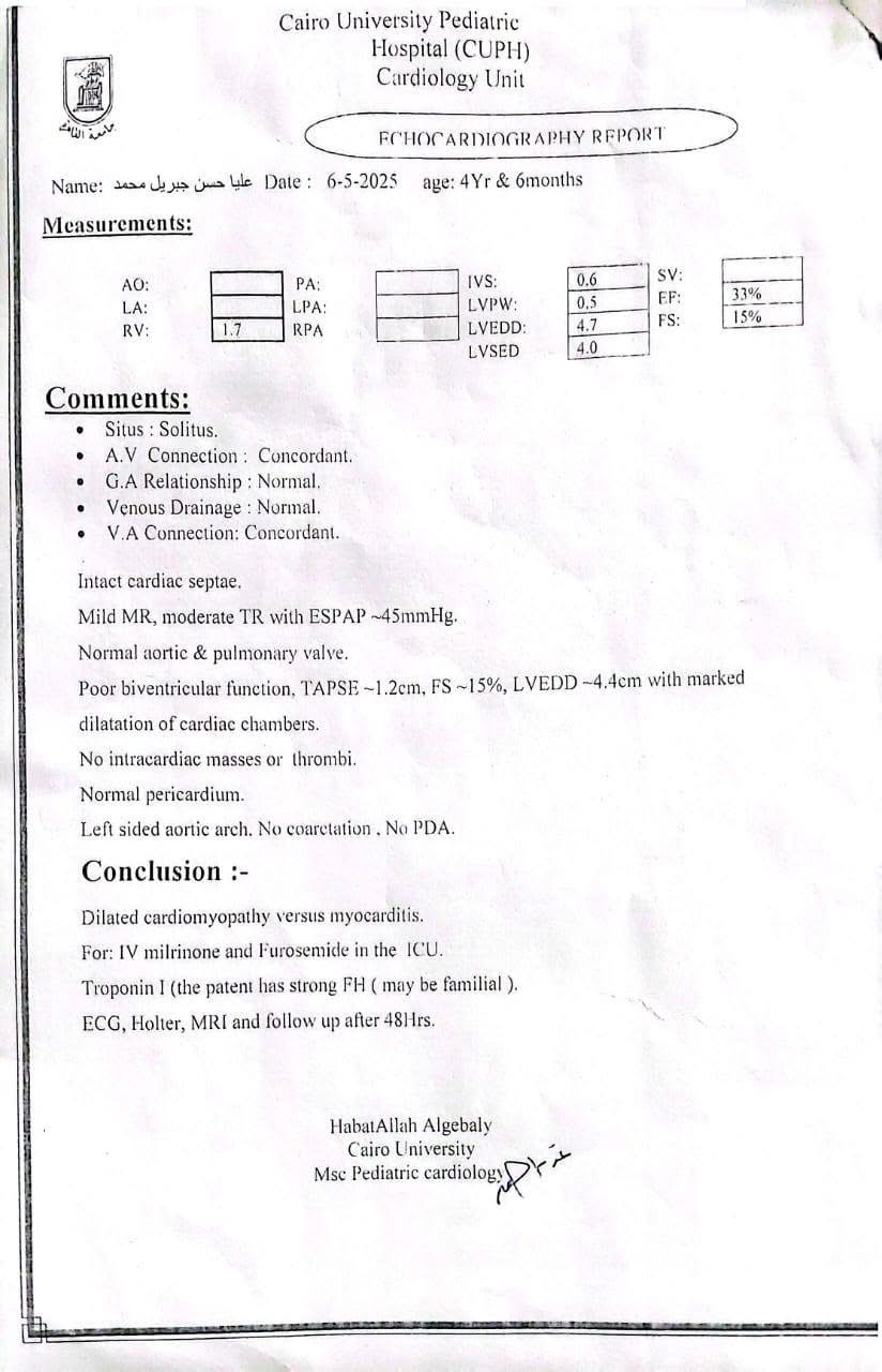 وكشفت أحد أقارب الطفلة تفاصيل الحالة الصحية لها، قائله "عليا حسن بنت خالي 4 سنوات ونصف الأسبوع الماضي جالها استسقاء في معدتها كبير والبنت مكنتش عارفة تتنفس ولا قادرة تتحرك وتعب شديد، لفوا كتير لحد ما عملوا إيكو على القلب وطلع في ضعف شديد في عضلة القلب وتضخم في القلب جامد، ودا طبعا أثر على كل وظائف الجسم وأثر على الكبد بشكل ملحوظ".